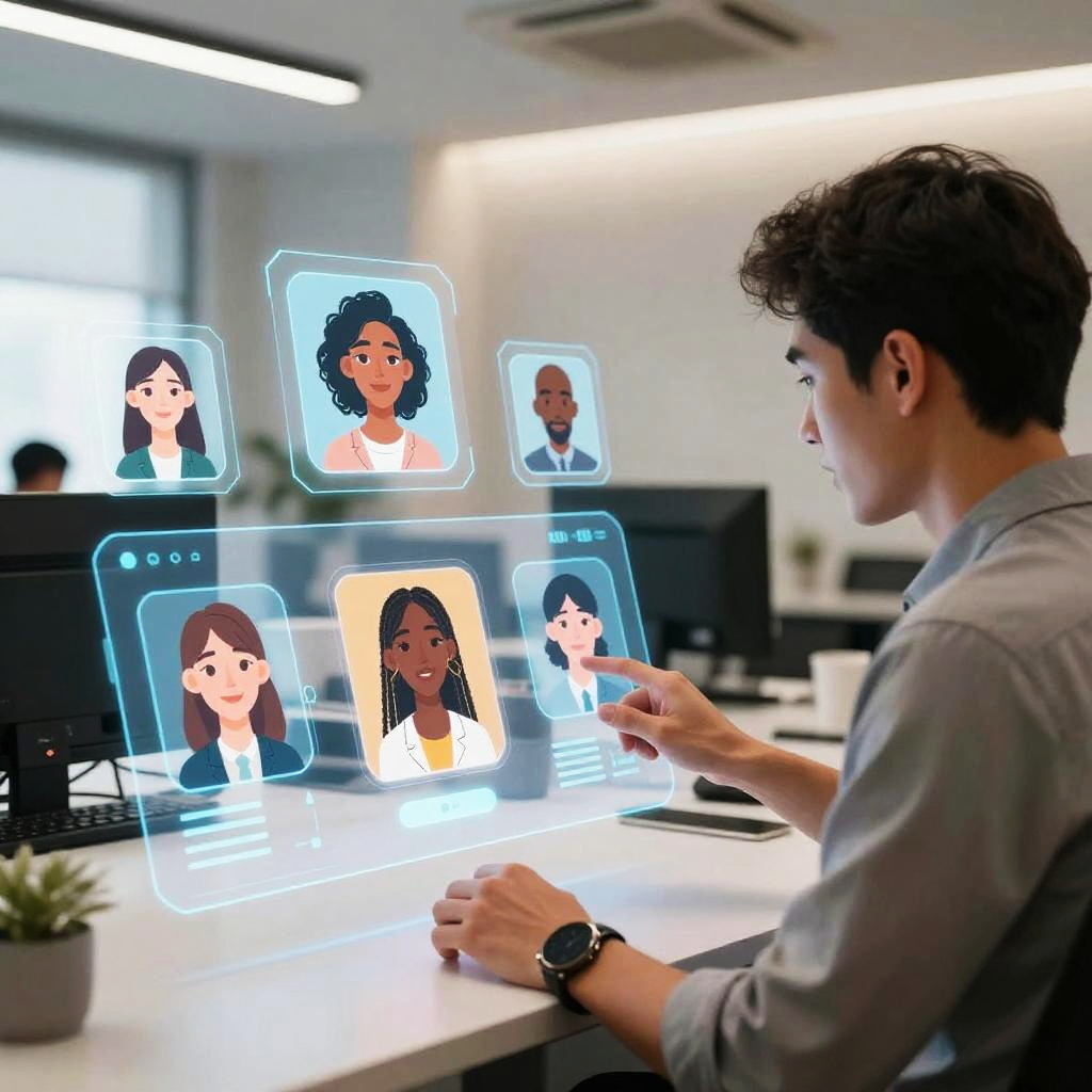 User interacting with AI profile generator on a translucent touchscreen, creating diverse and vibrant digital avatars, modern office setting with ambient lighting, holographic user profiles floating in space, innovative technology concept, clean design