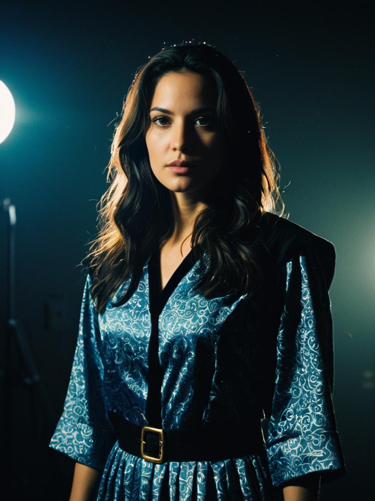 Woman in Mia costume, photorealistic studio portrait with cinematic lighting