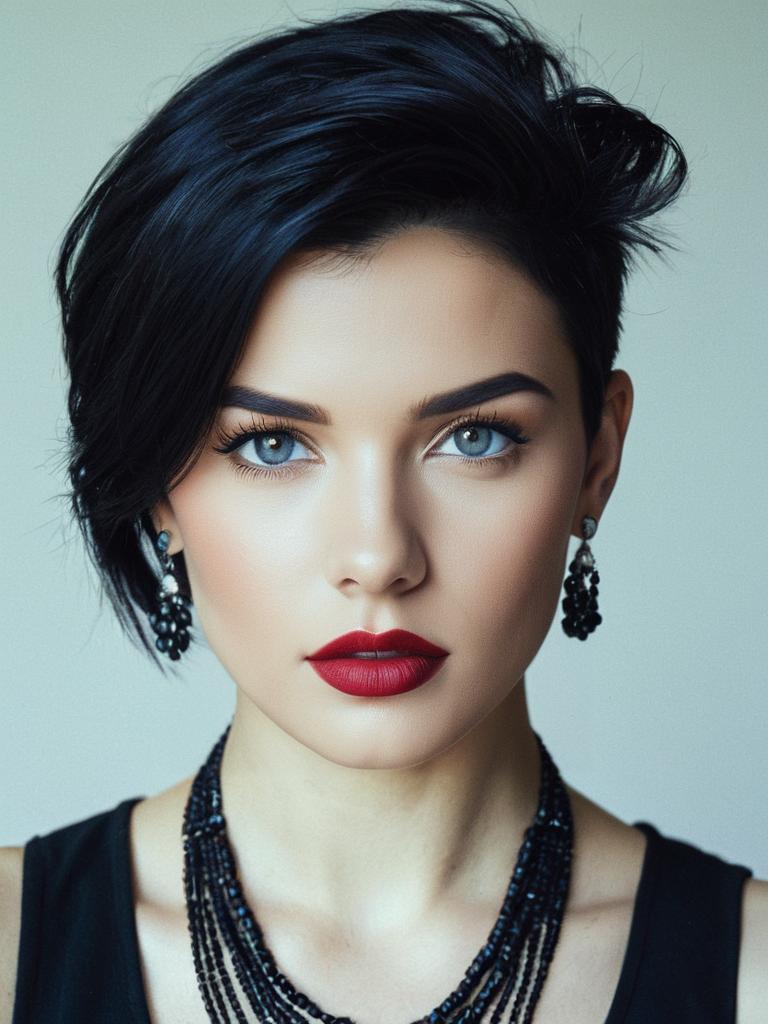 Undercut hairstyle female, 1girl, solo, jewelry, earrings, necklace, black hair, realistic, lips, short hair, blue eyes, looking at viewer, makeup