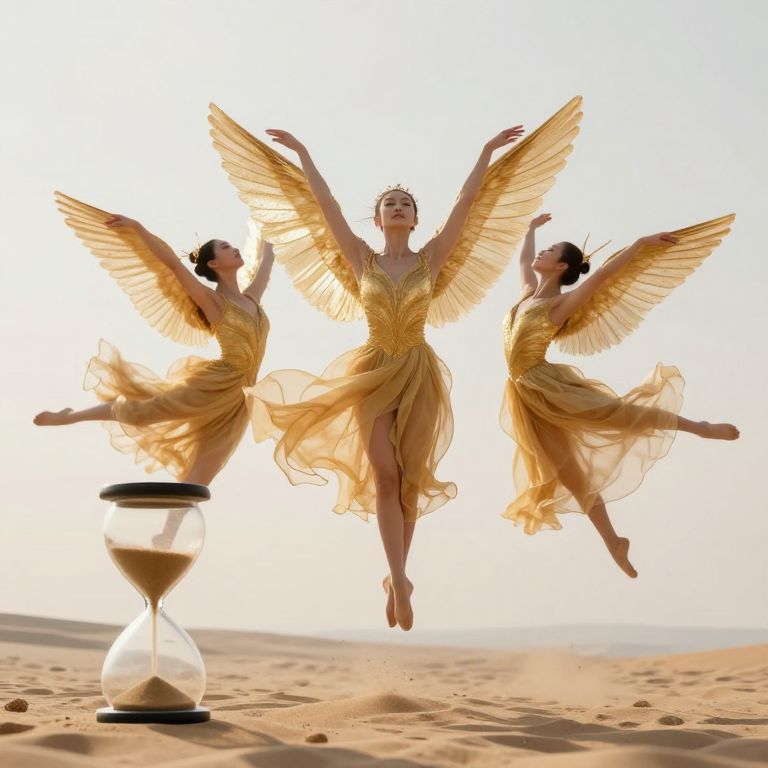 Dancers with golden wings gracefully levitate above hourglass sand, their flowing dresses and outstretched arms creating a surreal ballet performance against a soft, ethereal backdrop.