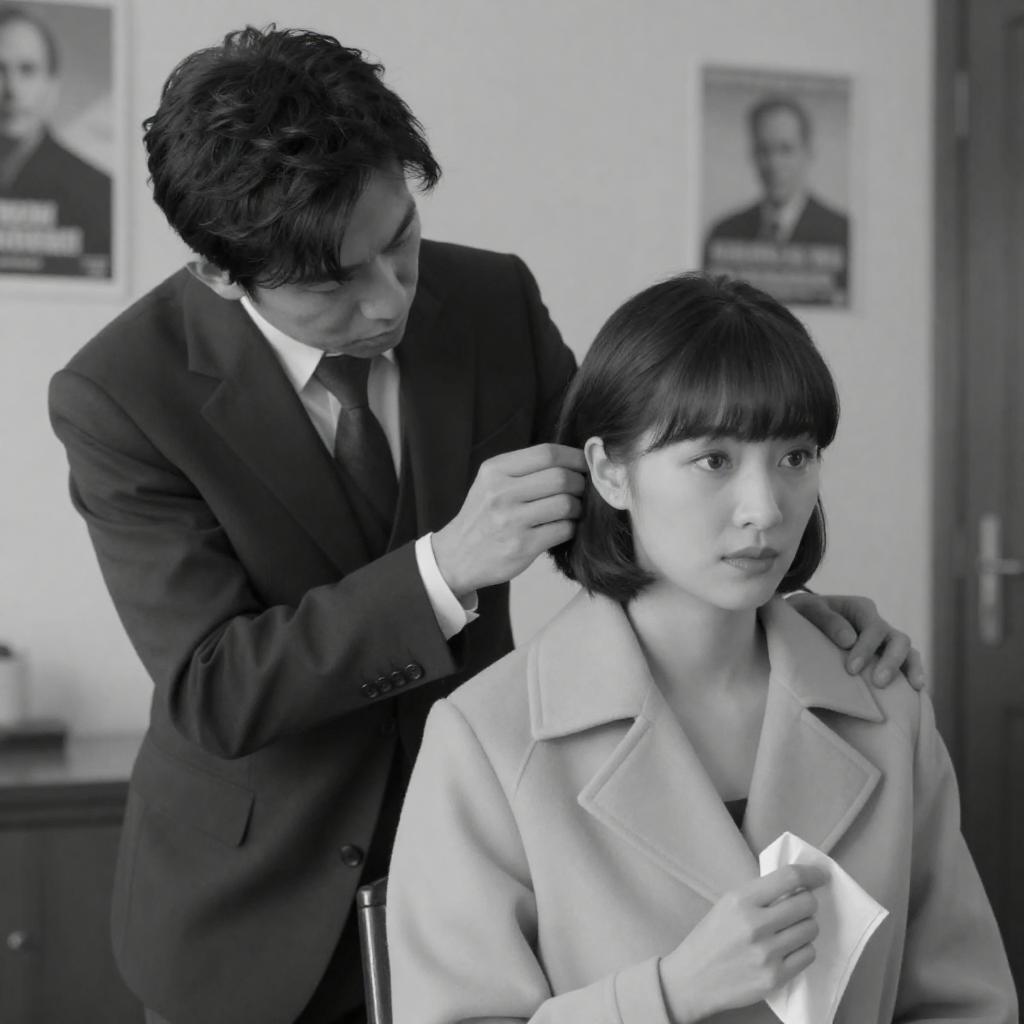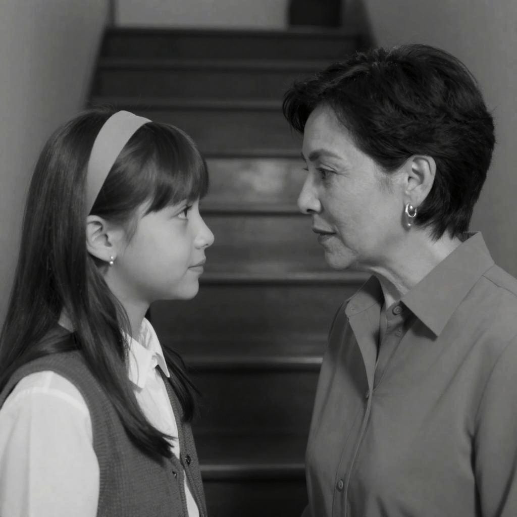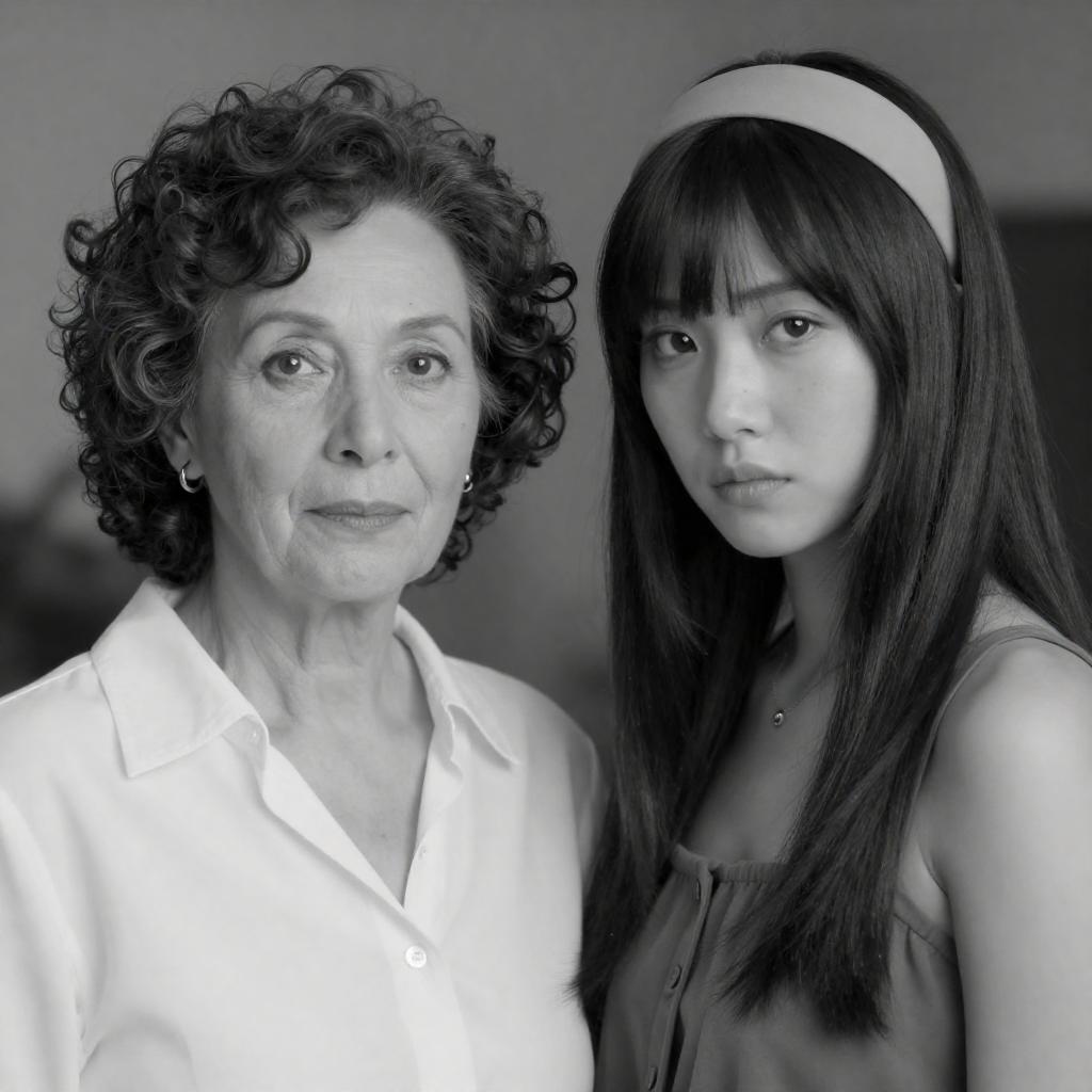 Black-and-white photograph of two women. Older woman with curly hair, expressive eyes, and white blouse on left. Younger woman with straight, bang-cut hair, serious expression, wearing a headband and sleeveless top on right. Background blurred.