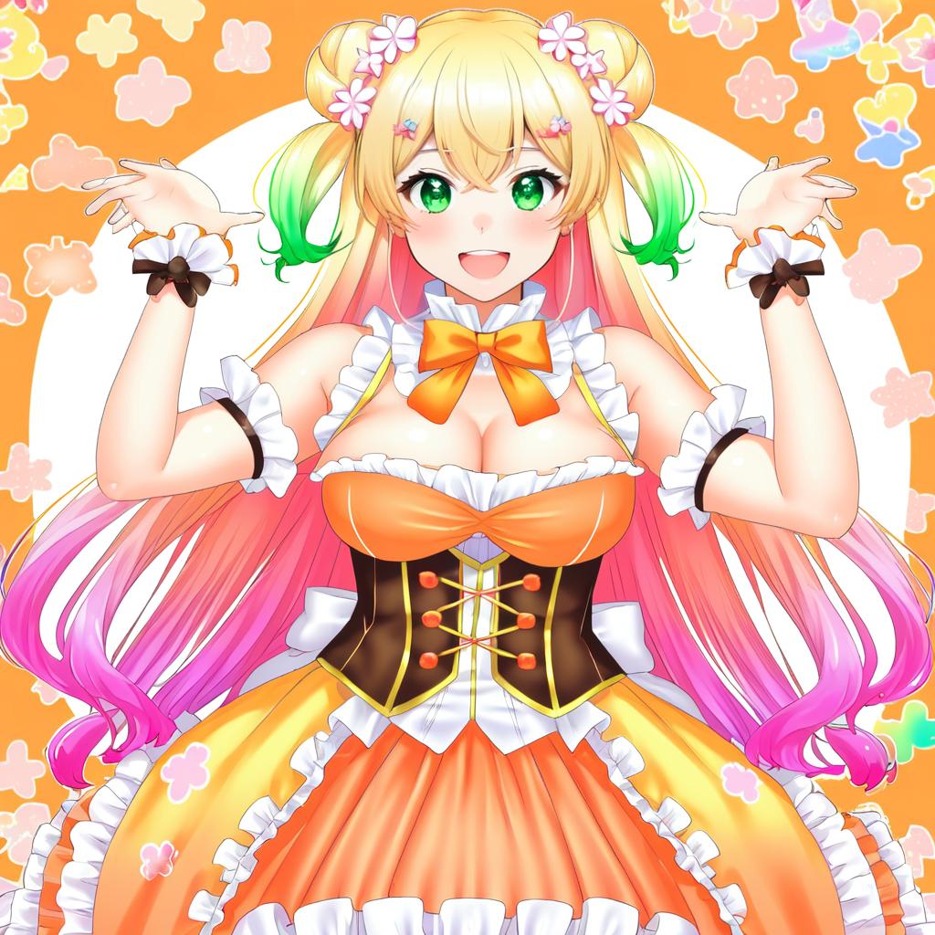 Momosuzu nene (1st costume), hololive, 1girl, fang, green eyes, hair between eyes, blonde hair, long hair, gradient hair, pink hair, two side up, double bun, hair flower, large breasts, medium breasts, cleavage, cleavage cutout, cutout above navel, frilled shirt, orange shirt, orange skirt, frilled skirt, sleeveless shirt, multicolored bow, brown bowtie, orange bowtie, yellow bowtie, multicolored bowtie, bare shoulders, virtual youtuber, virtual youtuber, underbust, corset, by artist baba (baba seimaijo), anime