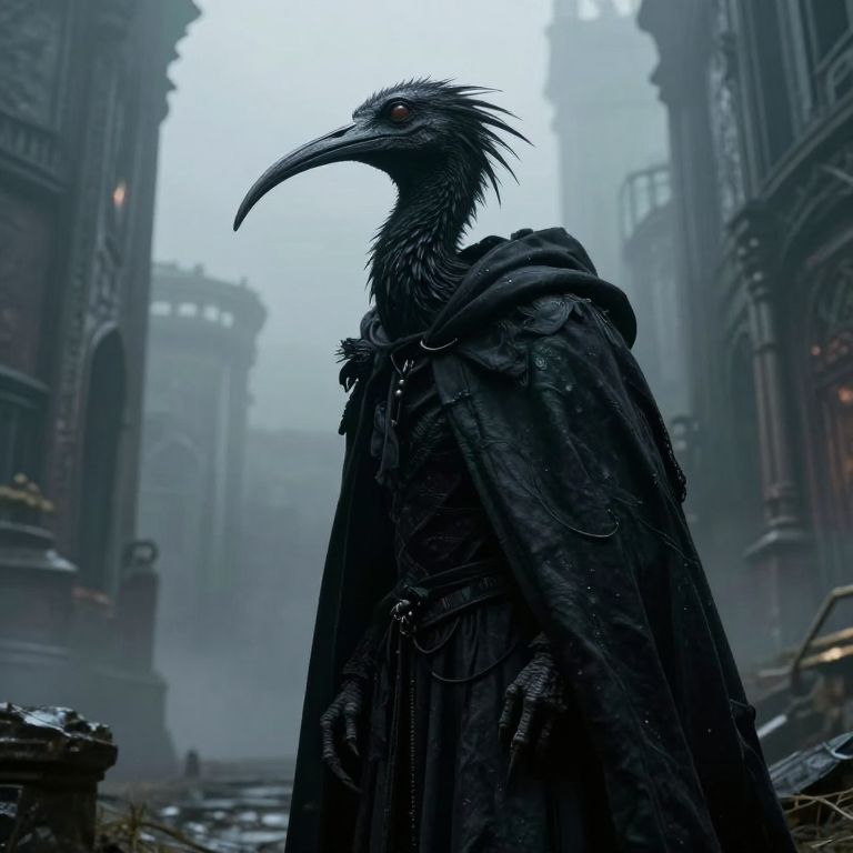 Digital artwork of a dark, feathered bird-like creature with a long beak, wearing a tattered black cloak, standing in a foggy,