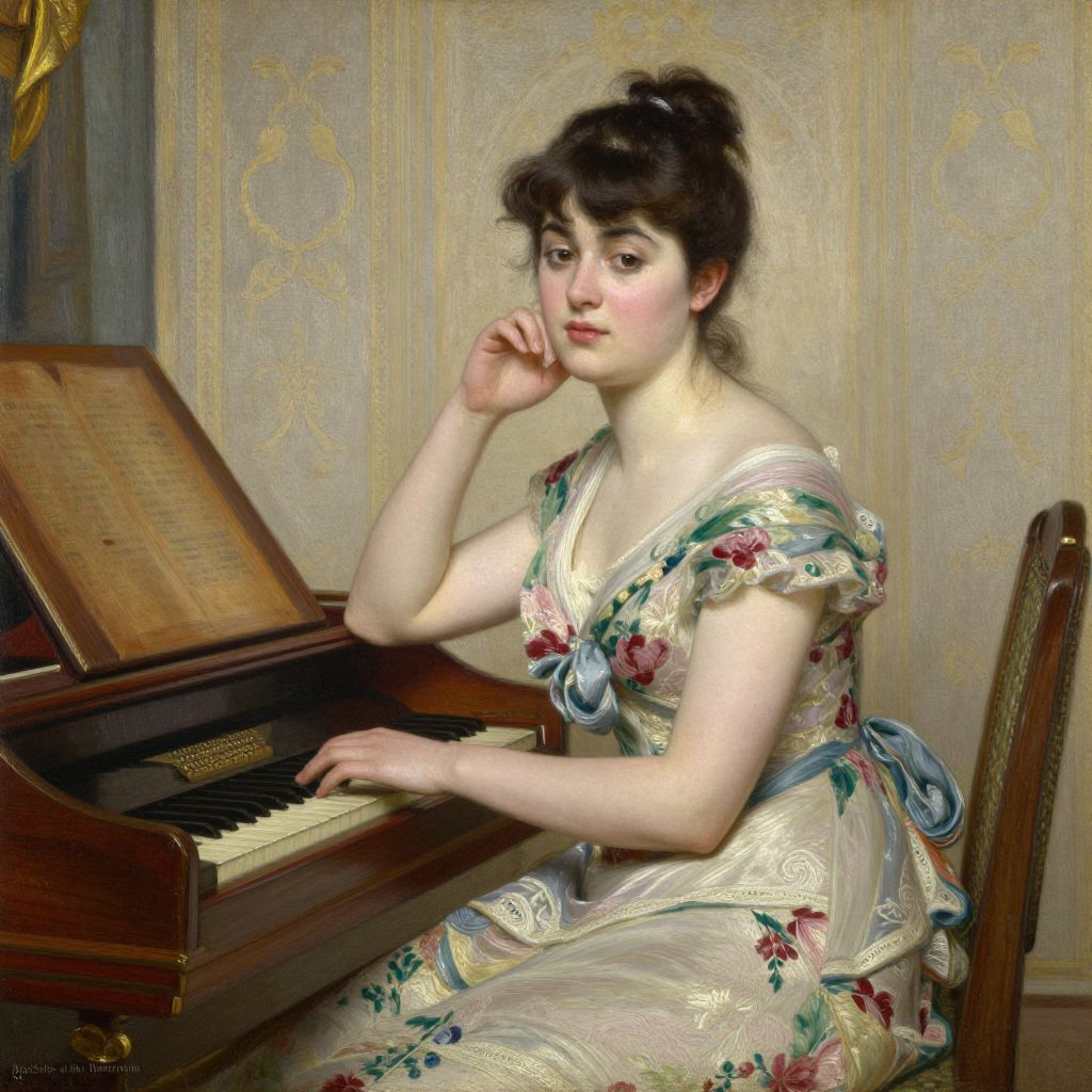 A finely detailed oil painting by Theo Van Rysselberghe, titled \"Maria Sethe at the Harmonium,\" depicts a serene portrait of a woman seated gracefully beside a harmonium, her elegant attire adorned with floral patterns that harmonize with the vintage wallpaper behind her, capturing the essence of classical realism with meticulous brushwork and soft, natural lighting.