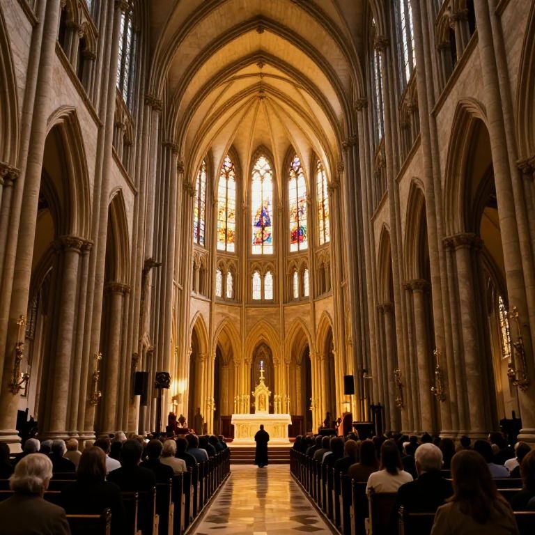 Vast Gothic arches soar skyward in a luminous cathedral, where rows of silhouetted congregants sit beneath warm golden light streaming through stained-glass windows, creating an ethereal atmosphere as figures gather along the central aisle toward a distant altar bathed in radiant illumination.