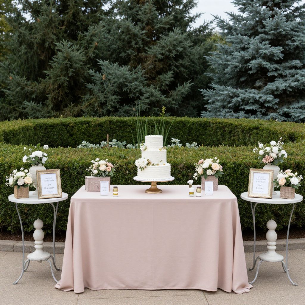 Elegant garden setup featuring a blush-pink tablecloth adorned with a tiered white cake, floral arrangements, and rustic decor, flanked by two matching side tables with framed signs and potted blooms, set against a backdrop of manicured hedges and evergreen trees.