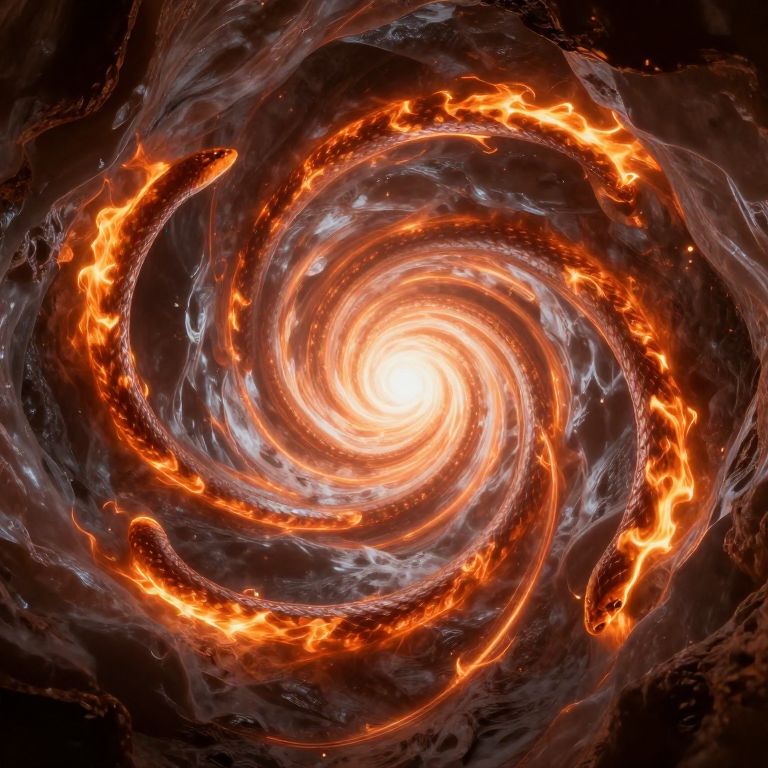 Glowing serpentine forms twist and spiral through a cavernous tunnel, their fiery orange trails illuminating the icy, textured walls as they converge toward a radiant, swirling vortex at the center.
