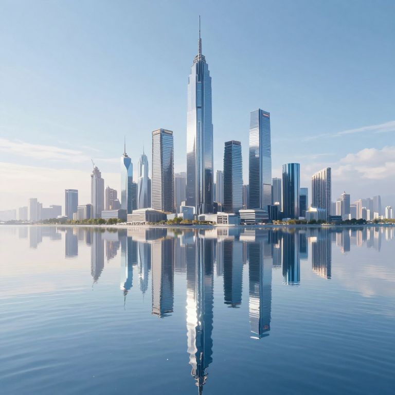 Photograph of a modern city skyline reflected in a calm, blue-water lake. The skyline features several tall skyscrapers with glass and steel facades, including a prominent, slender tower with a spire in the center. The buildings vary in height and design, with some having unique, angular shapes. The sky is clear and bright blue, adding to the overall crisp and clean aesthetic. The reflection in the water is nearly perfect, creating a mirror image of the skyline. The cityscape is located at the center of the image, with the lake occupying the foreground and background.