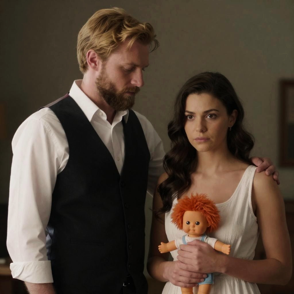 Photograph of a man and woman standing close together. Man with blond hair, beard, white shirt, black vest, looking downward. Woman with dark brown hair, white dress, holding a fluffy orange doll, looking serious. Dark, blurred background. Man's hand on woman's shoulder.