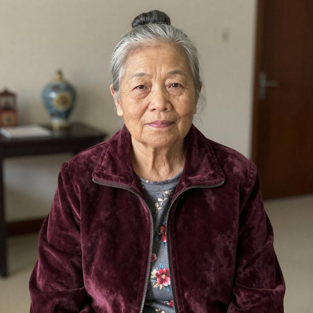 Elderly man with bald head, wearing dark winter coat with fur collar, stands outdoors holding a cane, brick building background, green and yellow foliage, trees, overcast sky, serious expression, one person.
