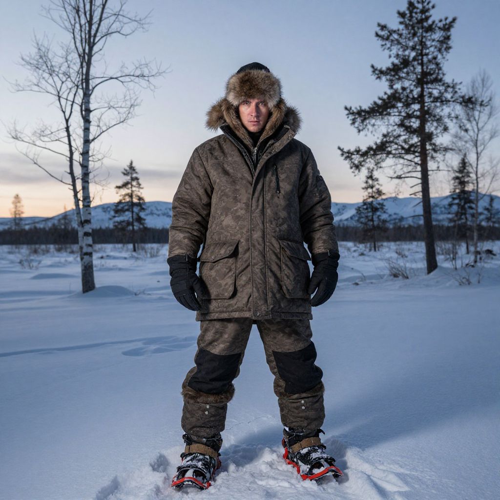 Photograph of a person standing in a snowy, forested landscape at dusk. The individual, centered in the frame, wears a dark brown, camouflage-patterned winter parka with a fur-trimmed hood, black gloves, black snow pants, and red snow shoes with black straps. They have a serious expression and are looking directly at the camera. The background shows a snow-covered field with sparse, leafless trees and a distant, softly lit horizon. The sky is a gradient of pale blue to orange, indicating the sun is setting. The snow is undisturbed except for footprints around the person.