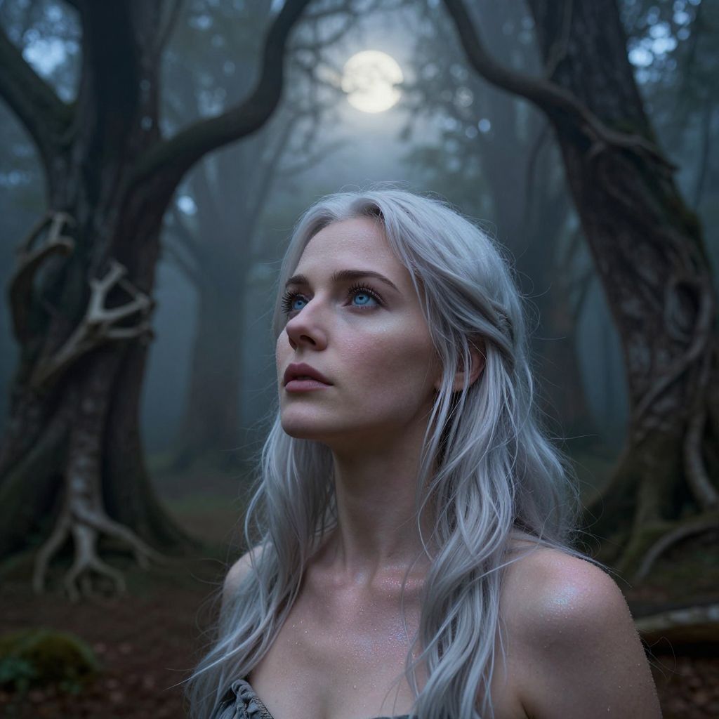 Photograph of a pale-skinned woman with long, silver hair, looking up in a misty, dark forest with twisted trees. Moonlight filters