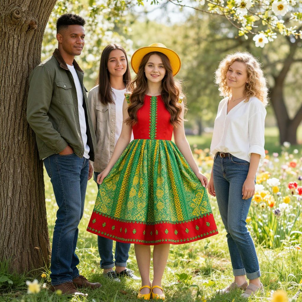A diverse group of four people standing in a sunny meadow, with a young woman in the center wearing a vibrant red and green dress featuring a yellow hat and yellow shoes. The dress has a detailed green and yellow patterned skirt with a red top adorned with small green leaves stitched along the hem and front. The woman has long, flowing brown hair and a warm, cheerful expression. To her left, a tall male with short black hair and a green jacket stands beside a tree. To her right, another female with curly blonde hair wears a simple white shirt and blue jeans, smiling gently. The scene is set in a lush, natural environment with blooming flowers and soft sunlight filtering through the trees, creating a lively and festive atmosphere.