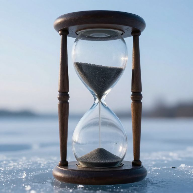 Amidst the serene expanse of icy stillness, a colossal hourglass stands as a haunting symbol of transience, its frozen sands eternally cycling between life and death, evoking a profound sense of melancholic contemplation and the relentless march of time.