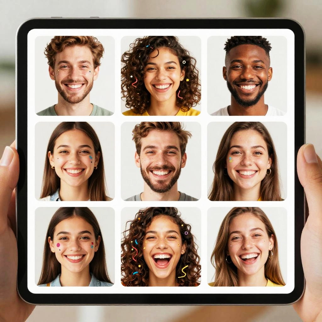 Smile filter online interface showing vibrant and playful digital overlay on joyful faces, realistic diverse people in natural lighting, user-friendly design elements, bright colors, happy mood, modern technology theme, seamless integration, high detail
