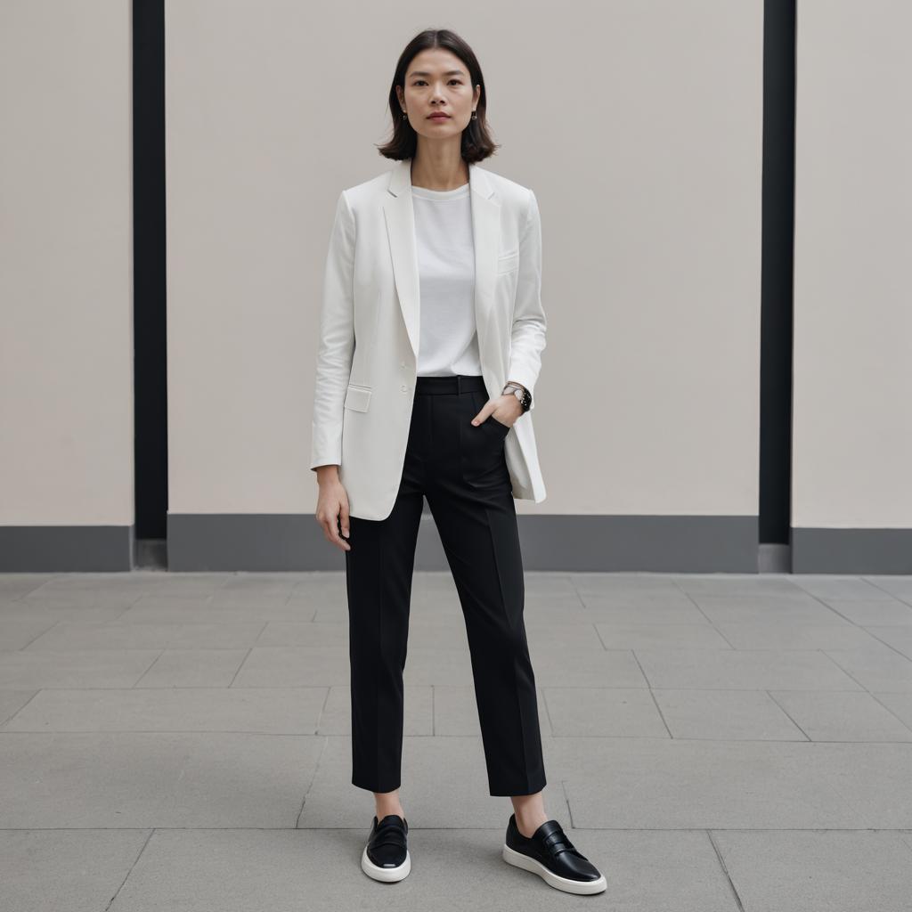 Portrait of an Asian woman with a short monochrome bob hairstyle wearing a sleek, tailored black blazer over a white cotton t-shirt and slim-fit black trousers. She is styled in minimalist fashion with black leather casual sneakers, standing against a plain light grey background in a modern setting.