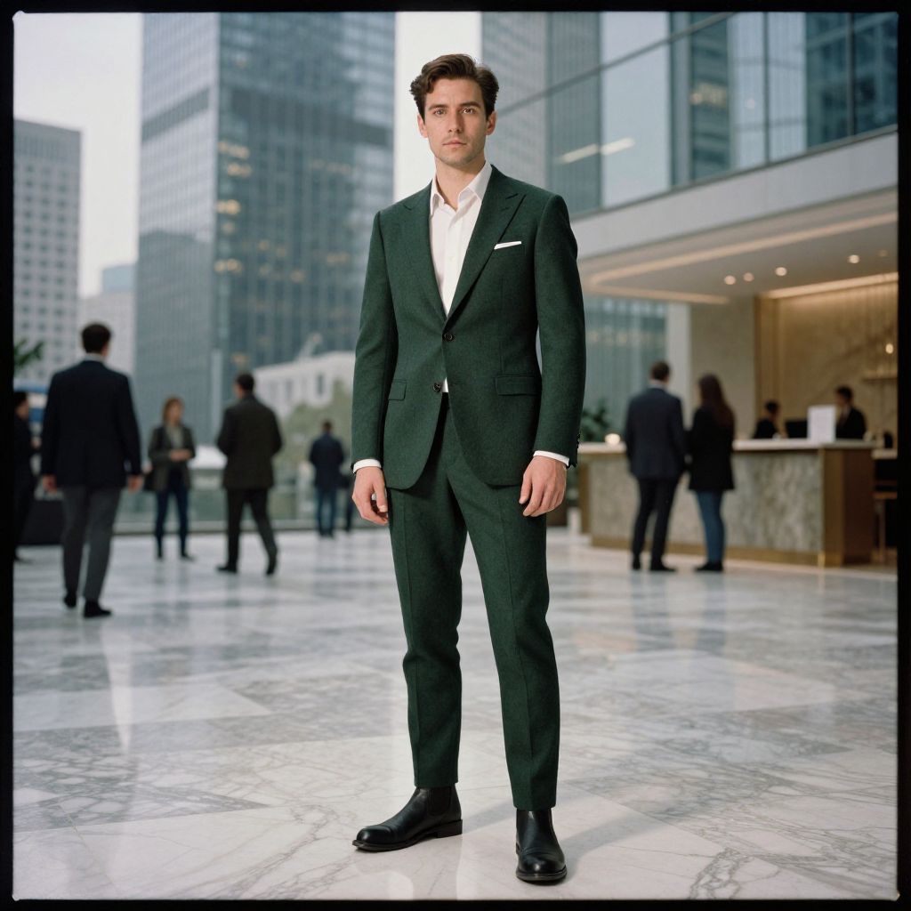 A man, dark green wool suit, tailored blazer, slim-fit trousers, white poplin shirt, black Chelsea boots, modern glass skyscraper, sleek lobby with marble floors, bustling reception area, calotype process, confident expression Man has masculine face and piercing eyes