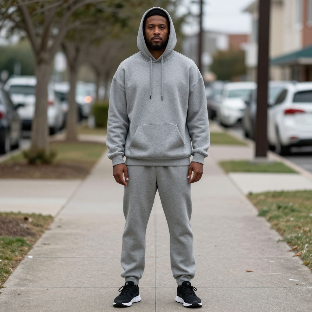 Essentials Sweatshirt Costume, man in a hoodie and sweatpants standing on a sidewalk