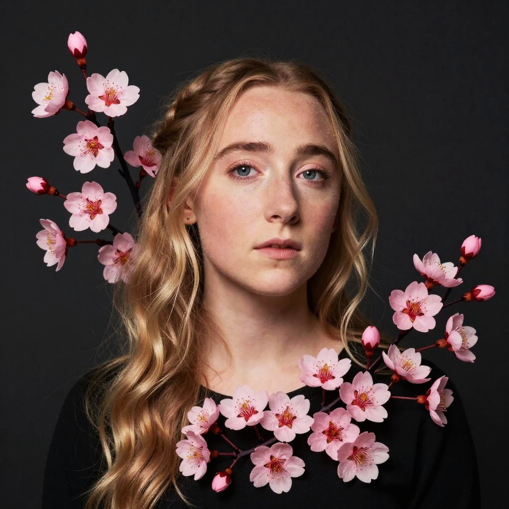 Realistic photo.Stencil art of Saoirse Ronan in the shape of blooming sakura on dark background, vivid colors, intricate and minimalistic realistic photo