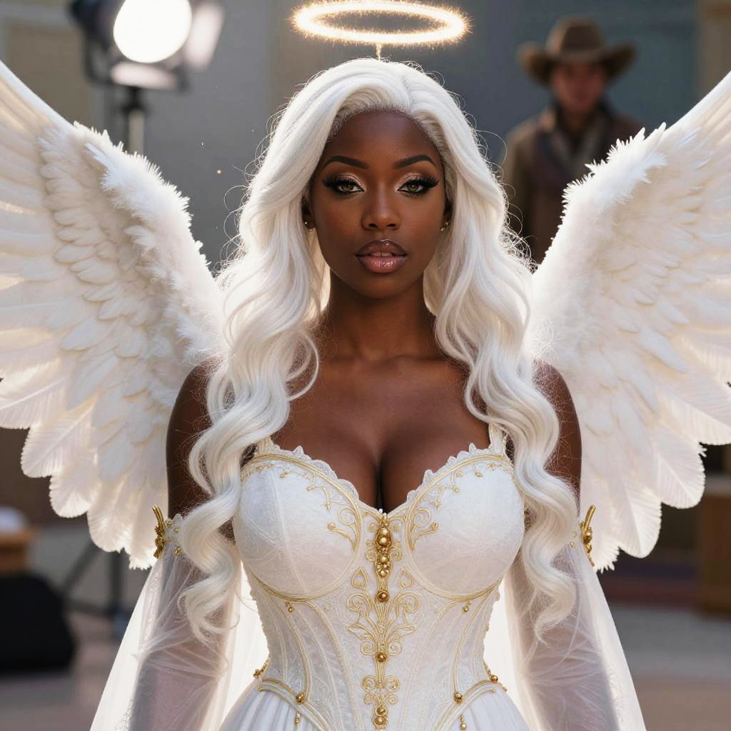 Photograph of a dark-skinned woman with long, wavy platinum blonde hair, wearing a white, lace-trimmed corset with gold accents that emphasizes her large breasts. She has large, white feathered angel wings and a glowing halo above her head. Her makeup is dramatic, with dark eyeliner and pink lipstick. The background is blurred, with a photographer's light stand to the left and a person in a hat to the right. The image has a fantasy, ethereal quality, with a focus on the woman's angelic appearance. The lighting highlights her figure, creating a radiant, otherworldly effect.
