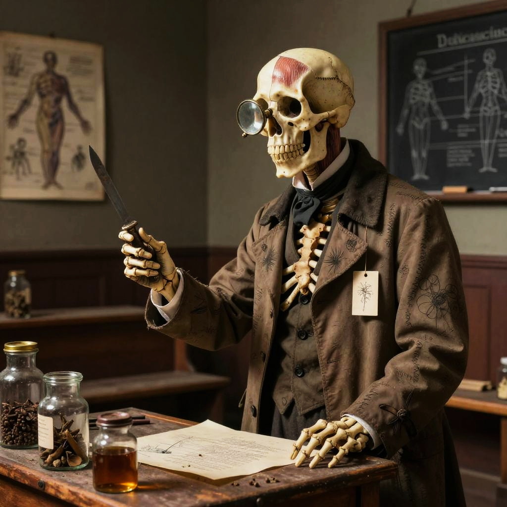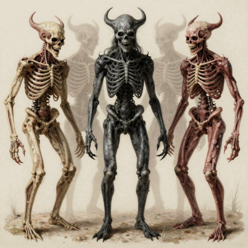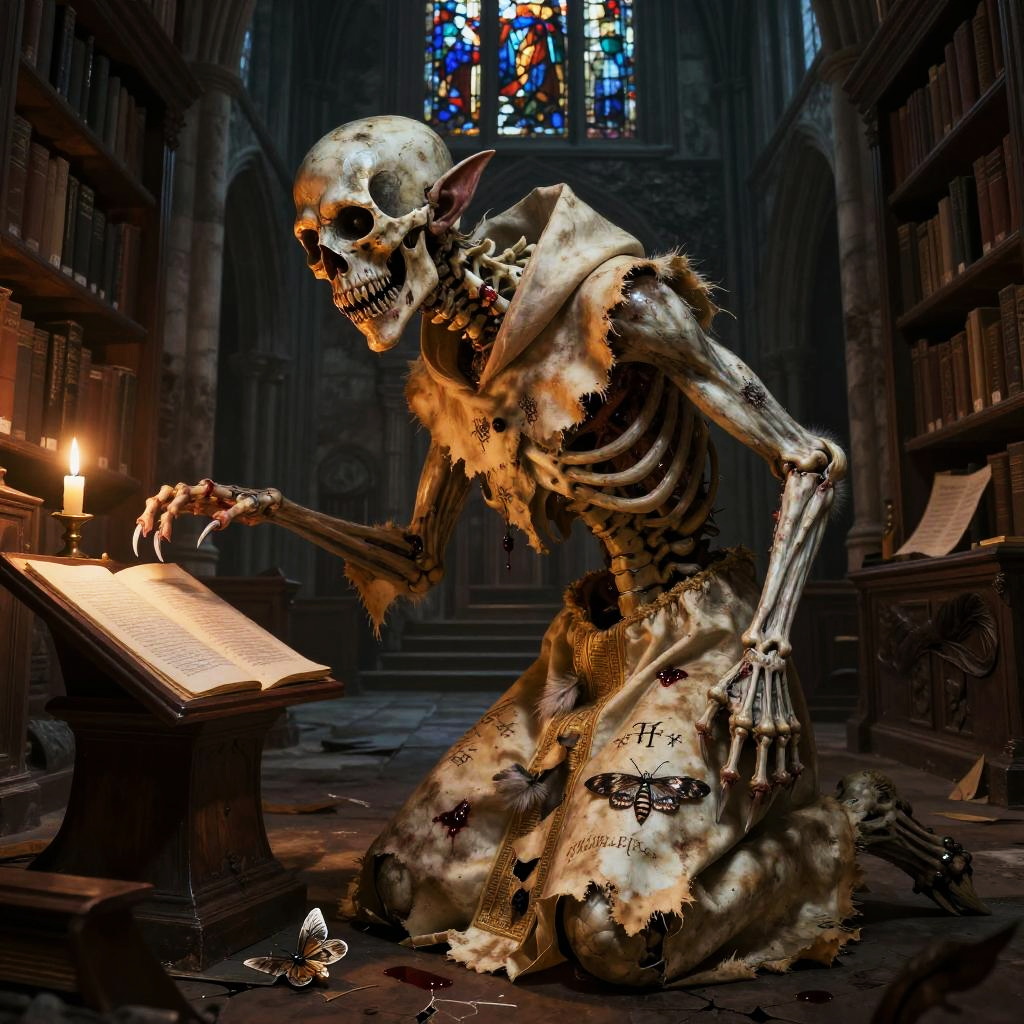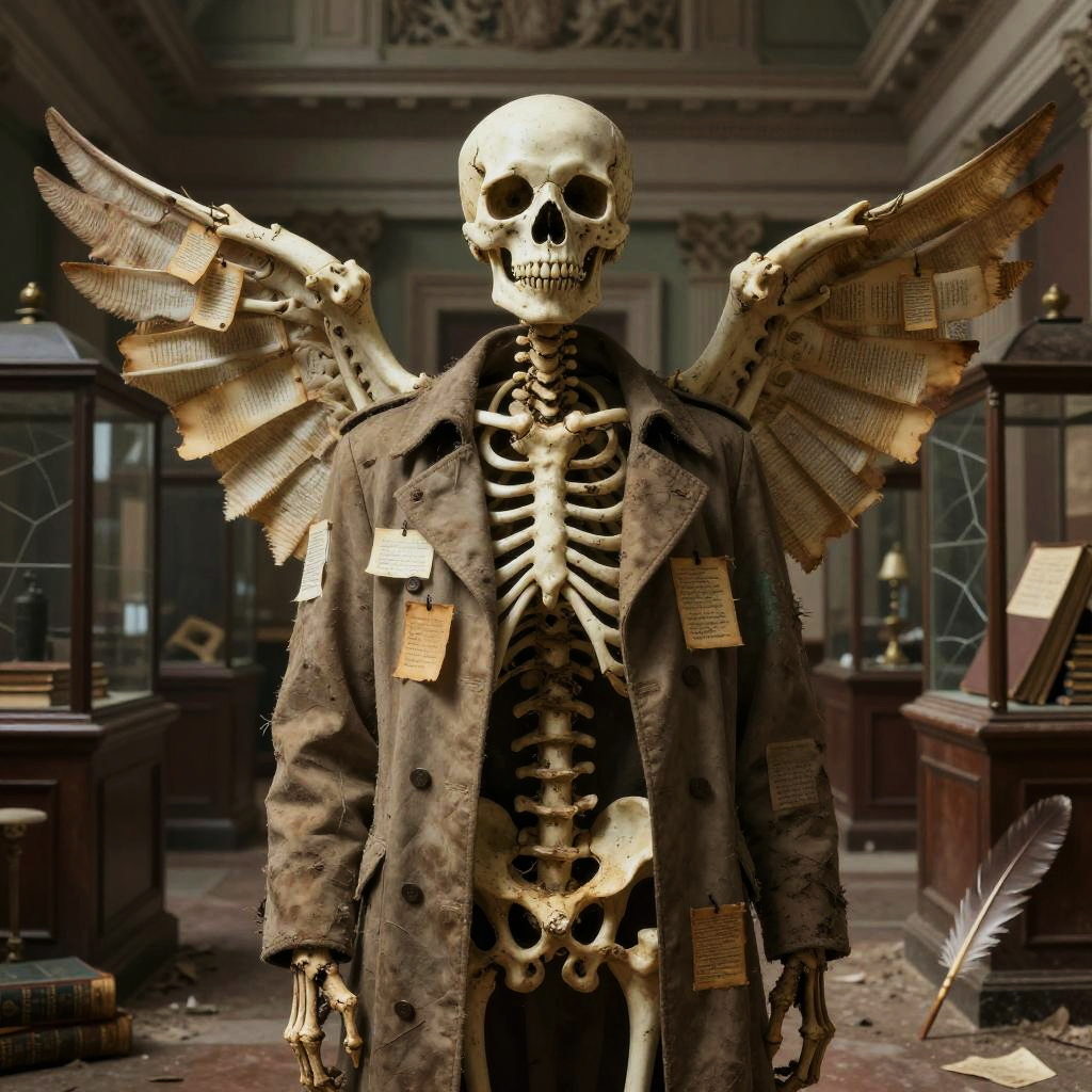 Osteophagic archivist (bone-devouring librarian) depicted in academic art style, detailed and haunting, environment dust-choked neoclassical museum hall with shattered vitrines and toppled pedestals, color palette ivory bone, liveried sepia, rust-brown, verdigris accents, face feature skullwork visage with a sliding jaw composed of interlocked vertebrae and catalog tags threaded through cheekbone sutures, body feature elongated, emaciated torso with ribcage-turned-wings of laminated bone and brittle rolled parchments, clothes moth-eaten curator's frock coat patched with archive labels and stitched index cards, lighting cold, clinical chiaroscuro (study lighting) with rim highlights on bone edges, mood clinical, obsessive dread, props ledger books fused to its spine, a bone quill dripping black ichor, suspended specimen jars containing petrified memories, pose leaning over a ruined lectern mid-catalog, long bony fingers splayed across an open grimoire, composition three-quarter view, slight high angle to emphasize obsessive scrutiny, scale roughly human scale but with unnaturally elongated limbs and wingspan, background rows of collapsed shelves filled with skeletal specimens, scattered index cards, broken glass, and pinned taxidermied eyes, texture focus porous, weathered bone, brittle parchment grain, oxidized brass clasps and threadbare wool, expression meticulous, detached hunger, accessories baroque spectacles fused to orbital bone, catalog tags on every joint, a rusted seal stamp embedded in its palm