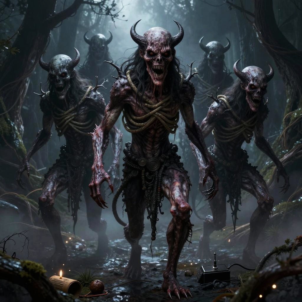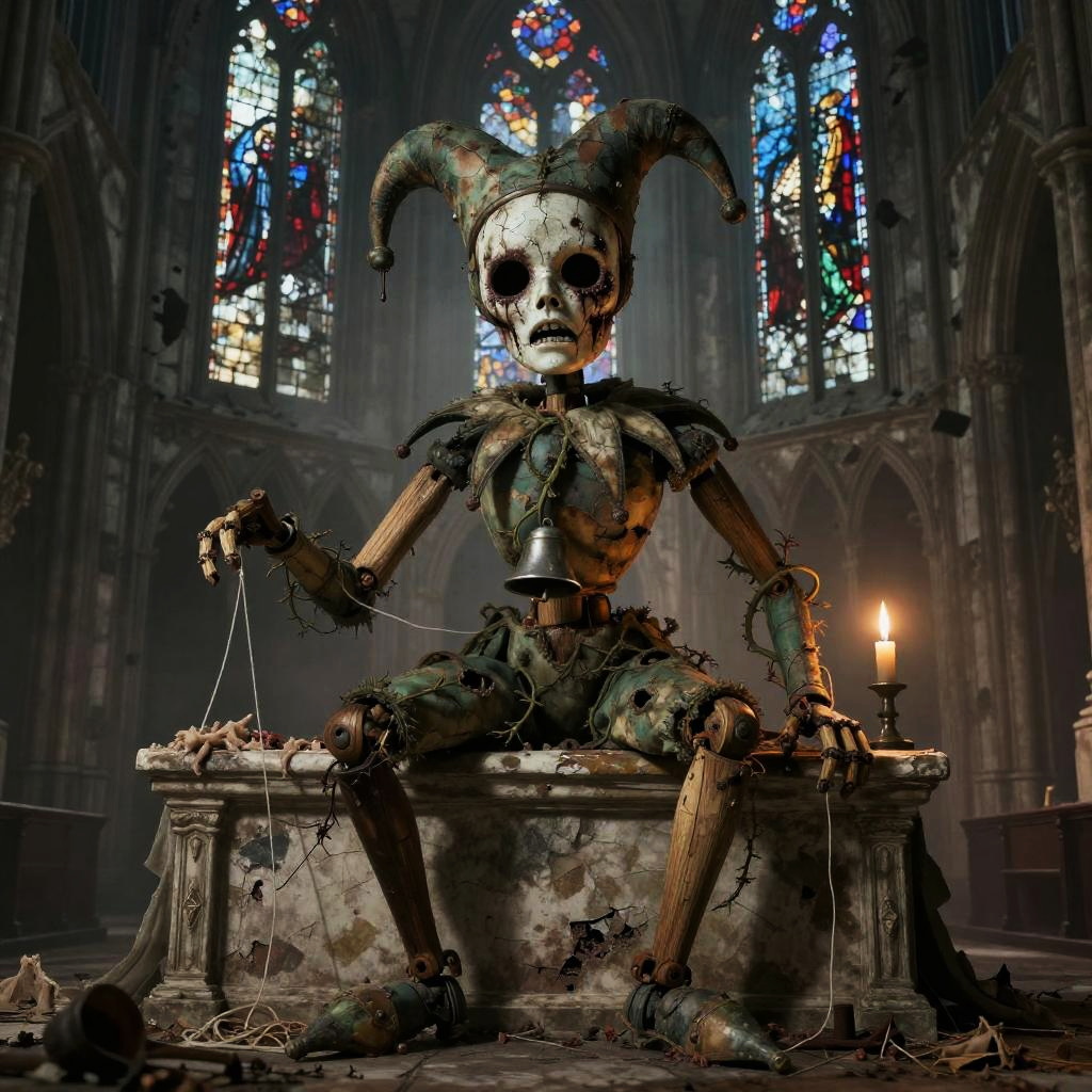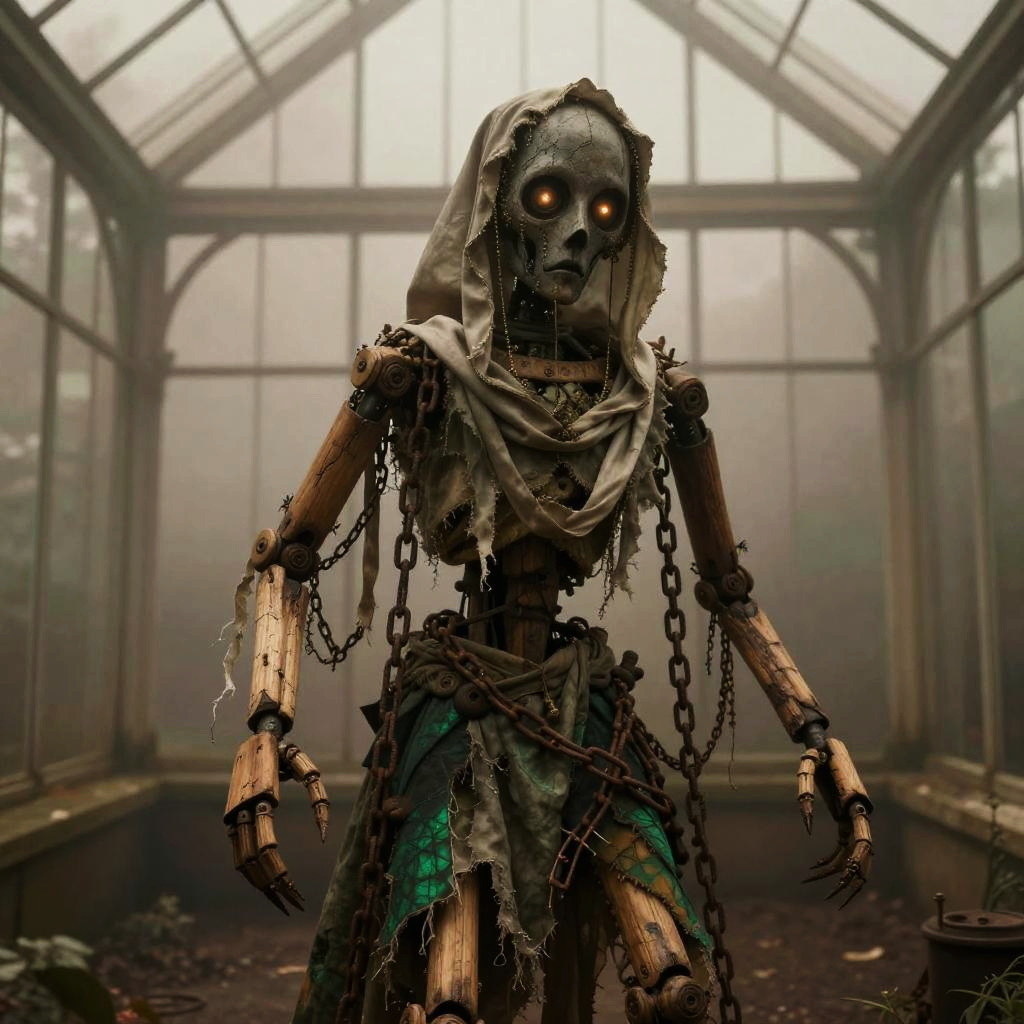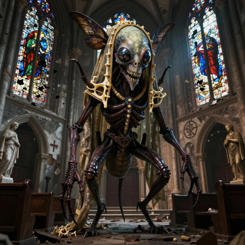 Osteophagic archivist (bone-devouring librarian) depicted in academic art style, detailed and haunting, environment dust-choked neoclassical museum hall with shattered vitrines and toppled pedestals, color palette ivory bone, liveried sepia, rust-brown, verdigris accents, face feature skullwork visage with a sliding jaw composed of interlocked vertebrae and catalog tags threaded through cheekbone sutures, body feature elongated, emaciated torso with ribcage-turned-wings of laminated bone and brittle rolled parchments, clothes moth-eaten curator's frock coat patched with archive labels and stitched index cards, lighting cold, clinical chiaroscuro (study lighting) with rim highlights on bone edges, mood clinical, obsessive dread, props ledger books fused to its spine, a bone quill dripping black ichor, suspended specimen jars containing petrified memories, pose leaning over a ruined lectern mid-catalog, long bony fingers splayed across an open grimoire, composition three-quarter view, slight high angle to emphasize obsessive scrutiny, scale roughly human scale but with unnaturally elongated limbs and wingspan, background rows of collapsed shelves filled with skeletal specimens, scattered index cards, broken glass, and pinned taxidermied eyes, texture focus porous, weathered bone, brittle parchment grain, oxidized brass clasps and threadbare wool, expression meticulous, detached hunger, accessories baroque spectacles fused to orbital bone, catalog tags on every joint, a rusted seal stamp embedded in its palm
