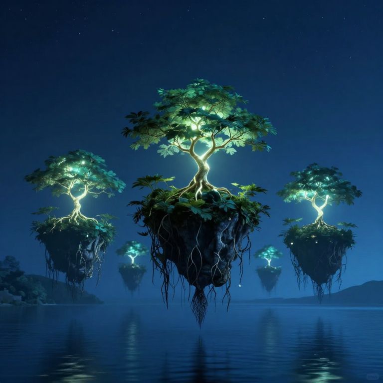 Islands suspended in the night sky, each crowned by a solitary tree glowing with ethereal light, cast roots downward into the tranquil waters below, defying gravity in a dreamlike archipelago.