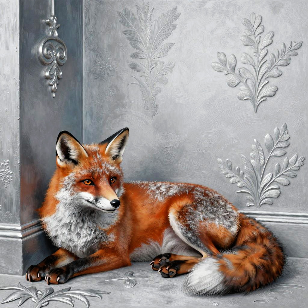 Illustration of an alert red fox, laying in the corner of a wall. Rendered in the style of cold silver and blue, influenced by Konstantinos Parthenis and Louis Majorelle, featuring surreal yet realistic textures and emotional depth.