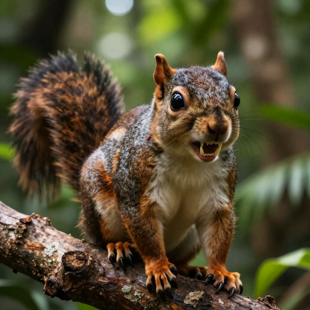 Close-up of a saber toothed squirrel with fierce glowing eyes, razor sharp teeth, perched on an ancient tree branch, lush jungle background, hyper-realistic digital art