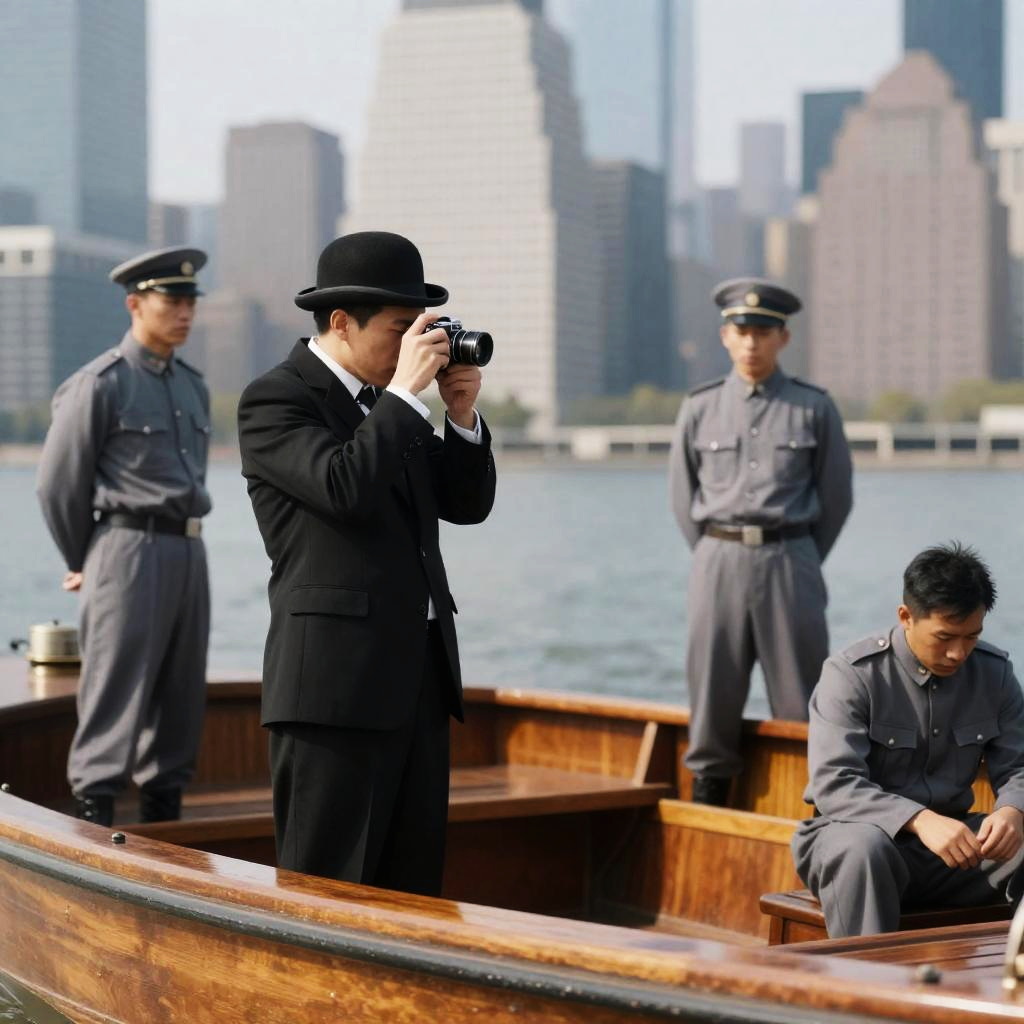 Photograph of a man in a black suit and bowler hat aiming a vintage camera on a wooden boat. Two men in gray uniforms stand nearby, one leaning against the boat's edge. City skyline with tall buildings in the background. Another man sits in the boat's corner, looking down. Bright daylight.