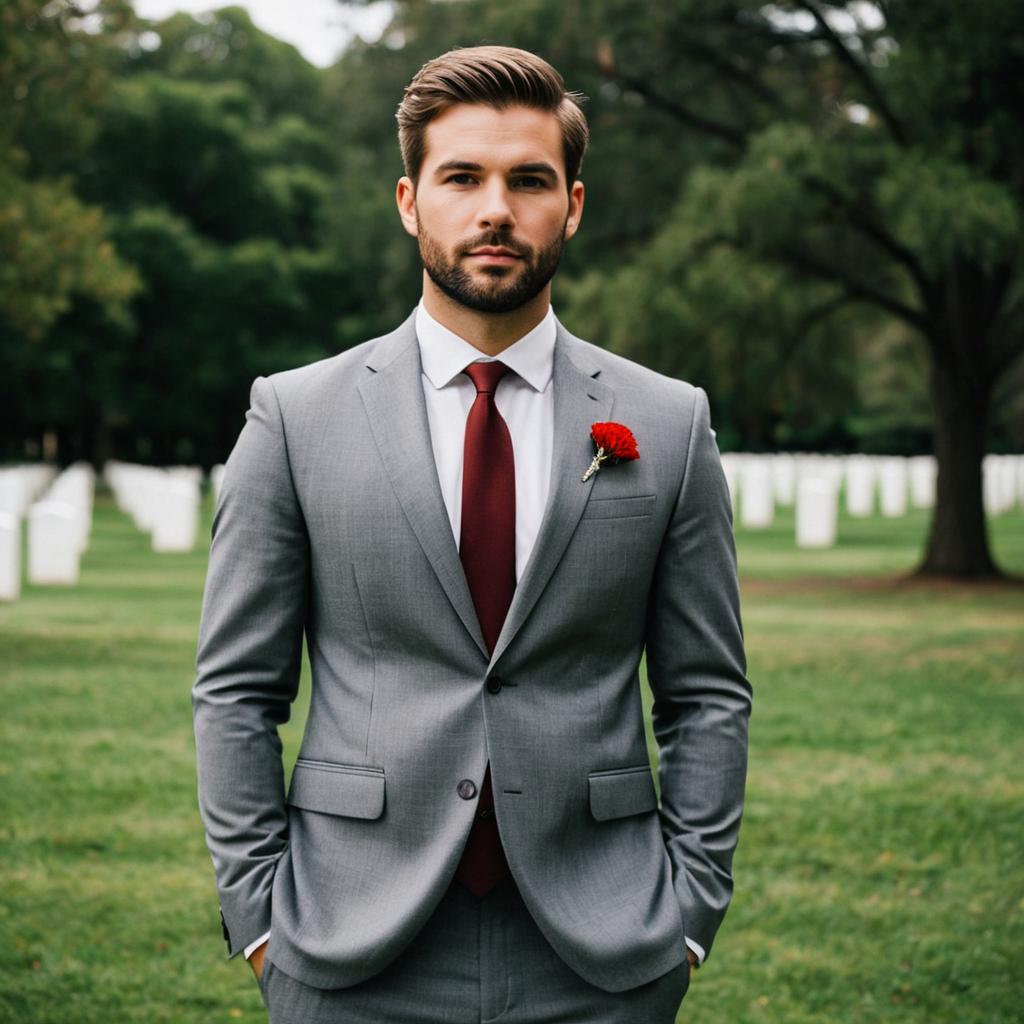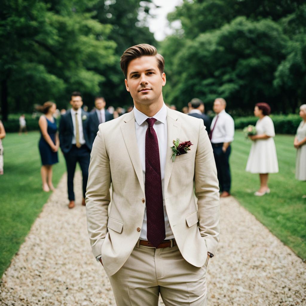 Man attire civil wedding, photograph of handsome young man, wearing beige suit, white dress shirt, burgundy tie and pocket square with greenery, standing on gravel path in lush green park, hands in pockets, short brown hair styled upwards, blurred background with other people, daytime, natural light, summer, formal attire, realistic, portrait, full body, standing, outdoors, fashionable, groomed, confident expression