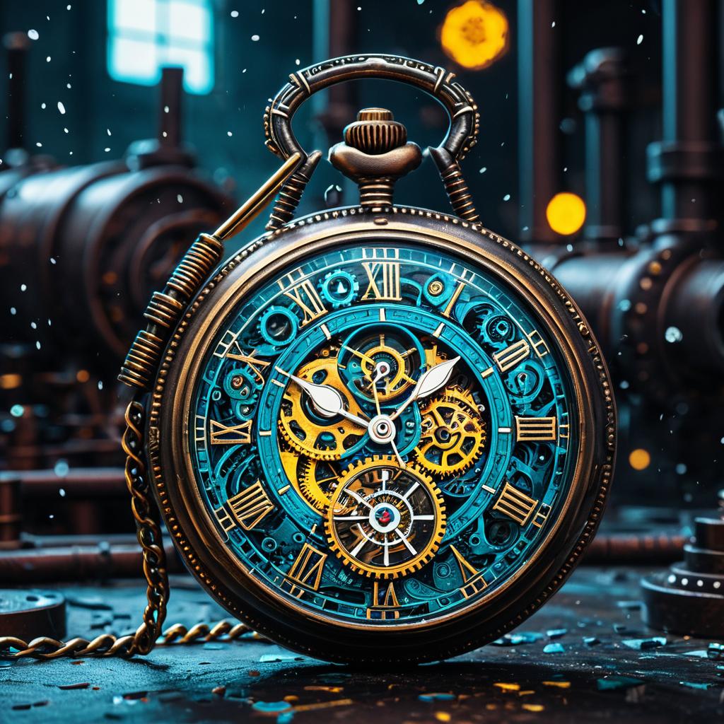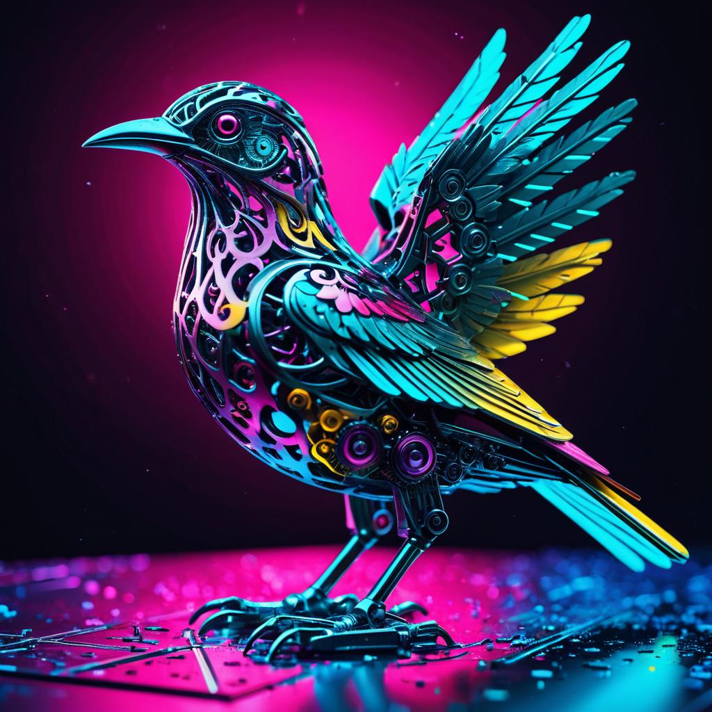 Ultra-HD close-up of a mechanical bird figurine with intricate 3D fractal details and neon color bursts. The bird features vibrant blue, pink, and yellow elements with detailed gears and feathers, styled in retro synthwave aesthetic on a shimmering liquid metal surface with scattered 3D primitives.