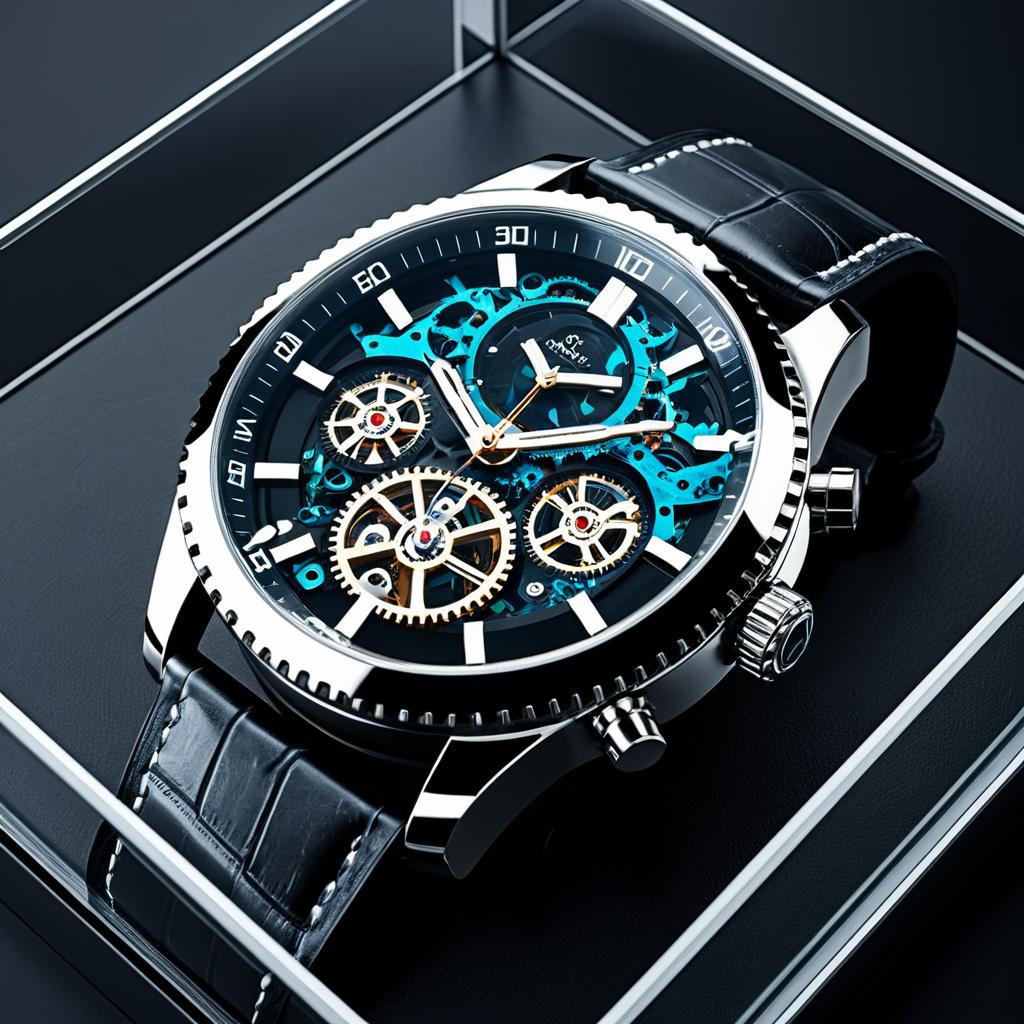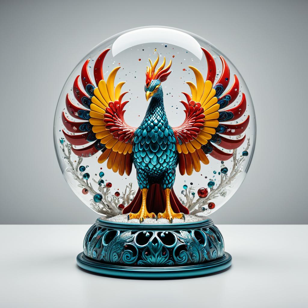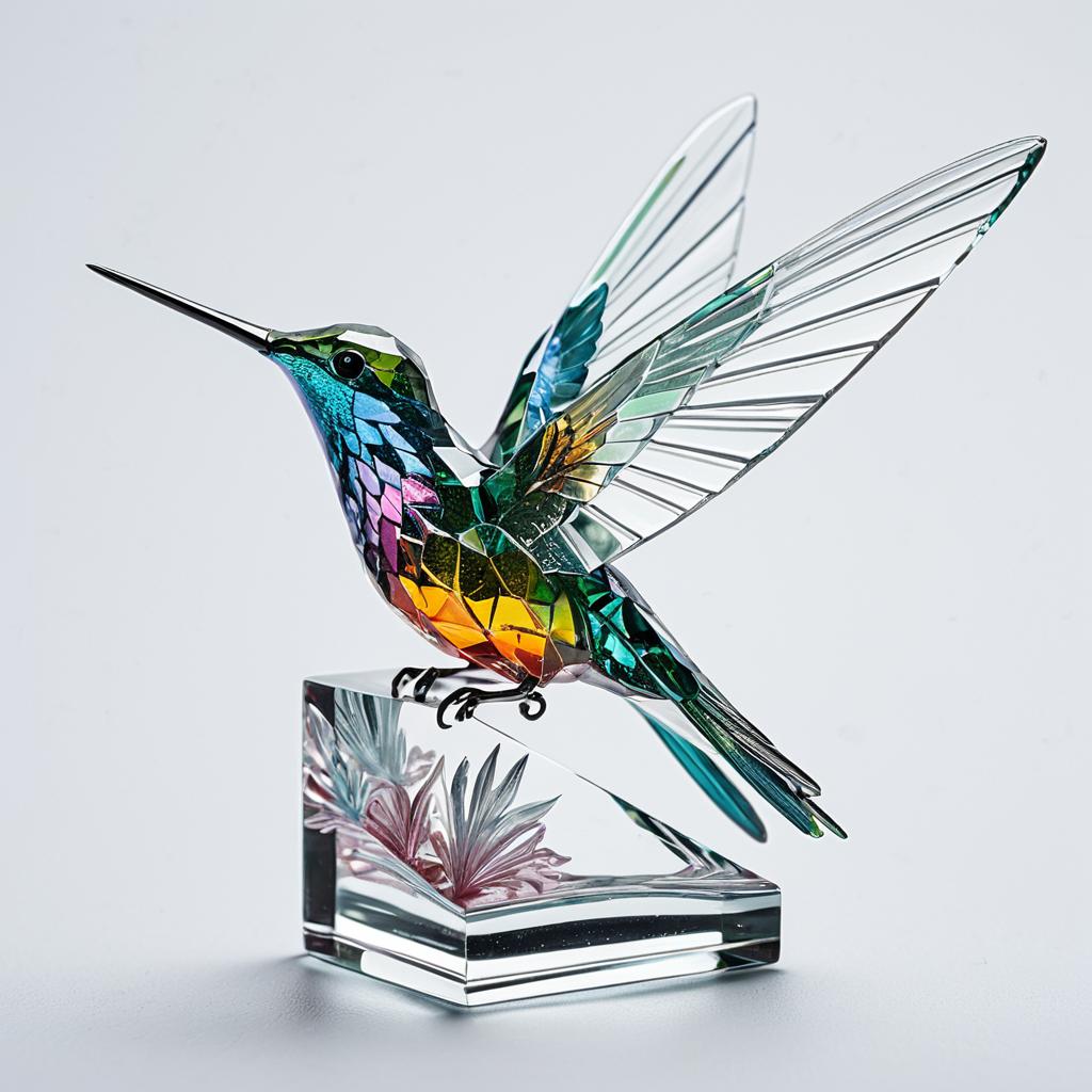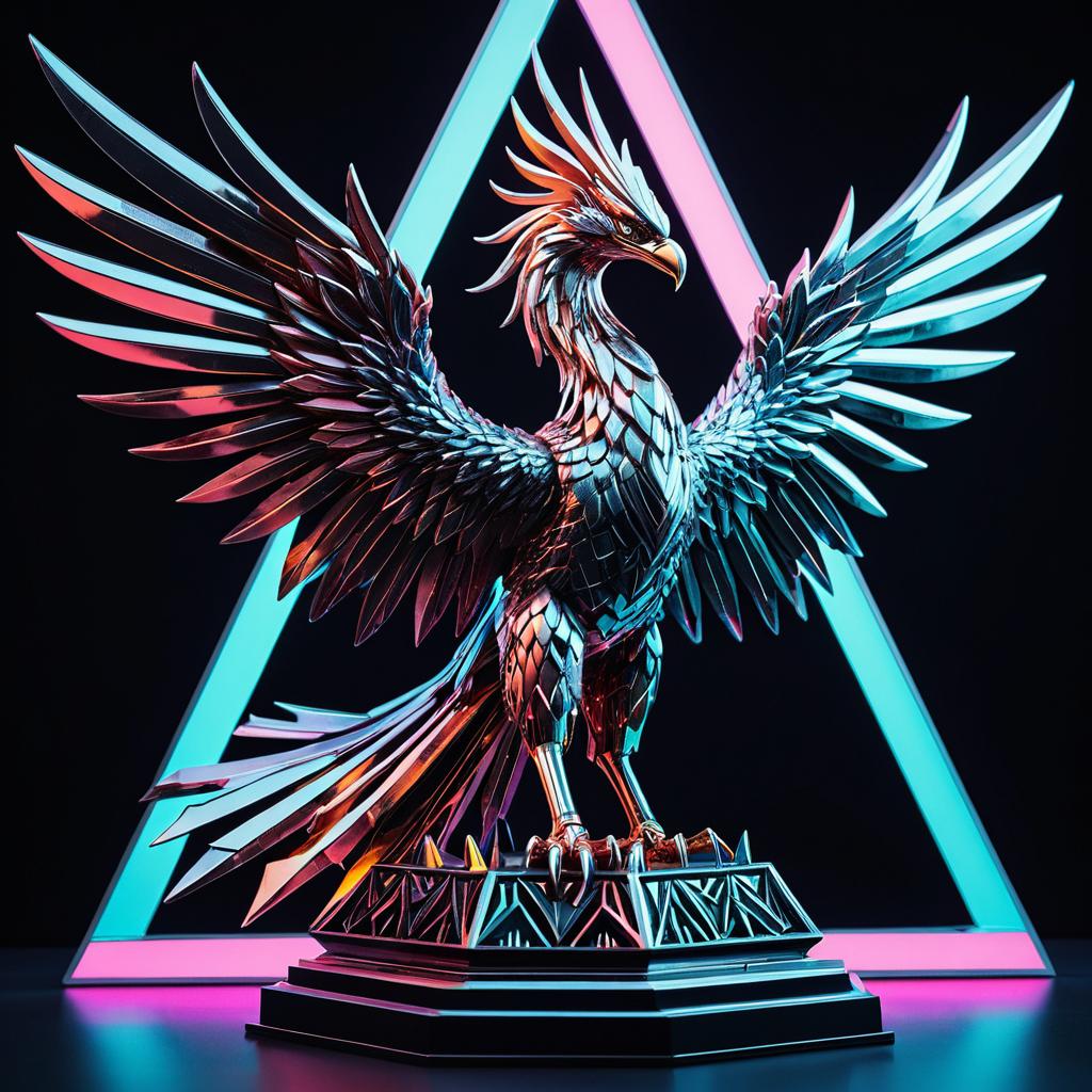 High-resolution ecommerce product shot of an intricately designed mechanical bird figurine with intricate 3D fractal details, captured in ultra-HD close-up with neon color bursts and scattered 3D primitives, set in a shimmering liquid metal surface, styled in vibrant retro synthwave style, by Jonathan Ive and Pictoplasma, photoreal simulation.