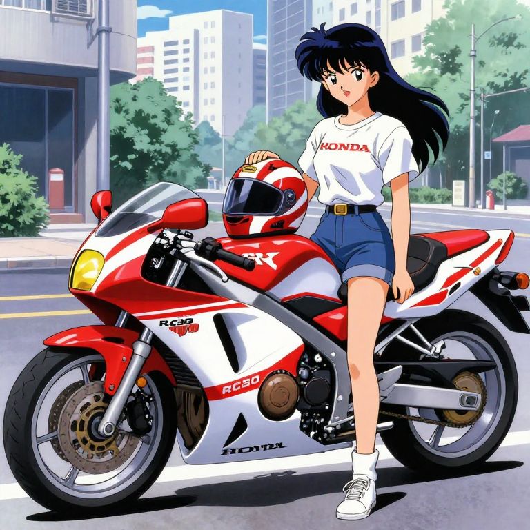 A 90's anime scene featuring a Honda RC30 motorcycle parked along the curb downtown, with a 90's anime girl holding a motorcycle helmet, showcasing high detail.