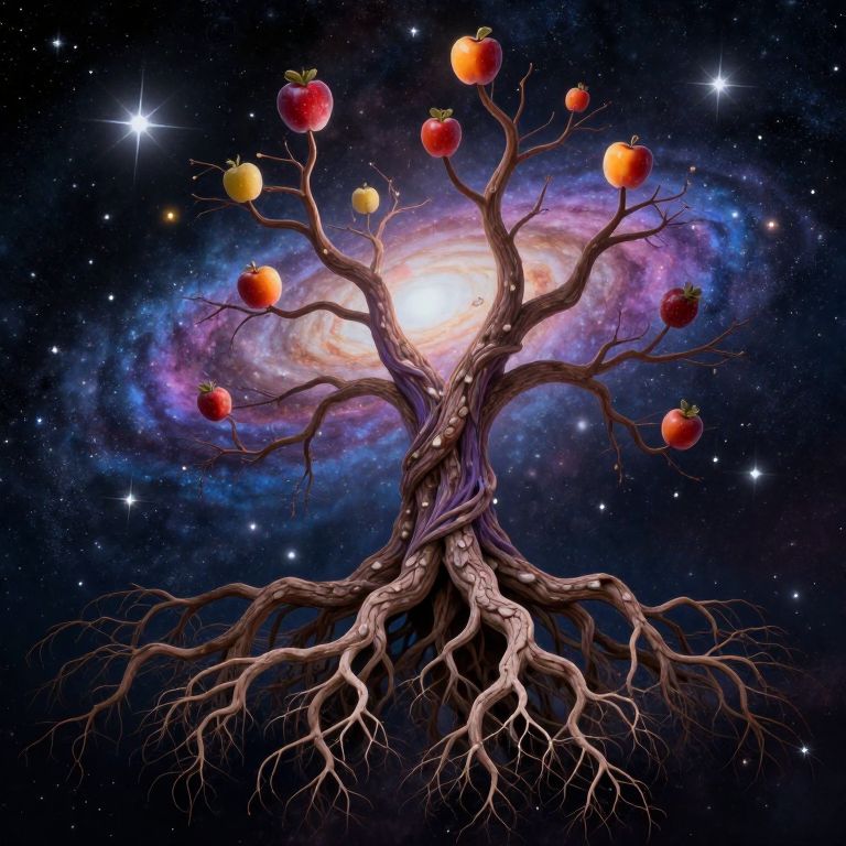 Digital art of a twisted, leafless tree with sprawling roots, adorned with red and yellow apples, set against a vibrant, starry galaxy and swirling