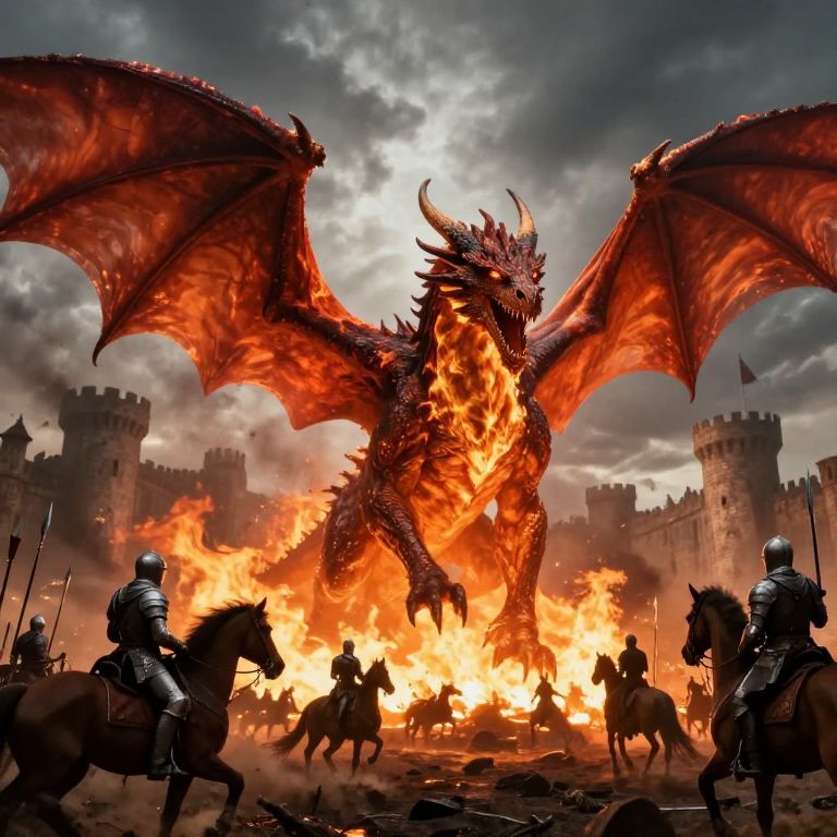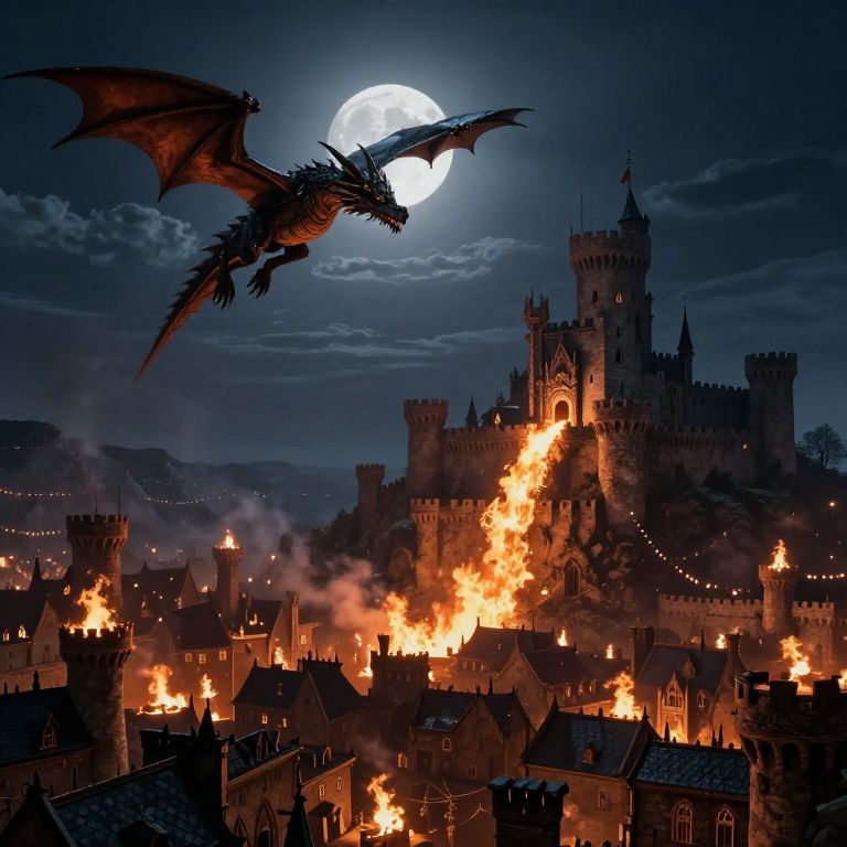 Photograph of a burning medieval castle under a full moon, with a dragon breathing fire from the sky, dark clouds, and bright orange flames illuminating