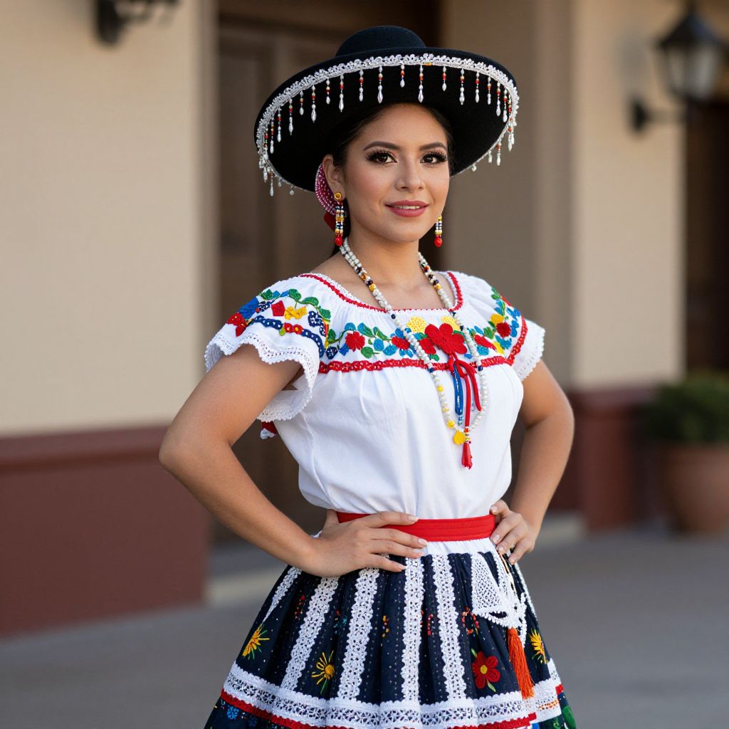 Photograph of a smiling Latina woman in traditional Mexican folk dress, white blouse with colorful embroidery, black lace skirt, red sash, and black hat