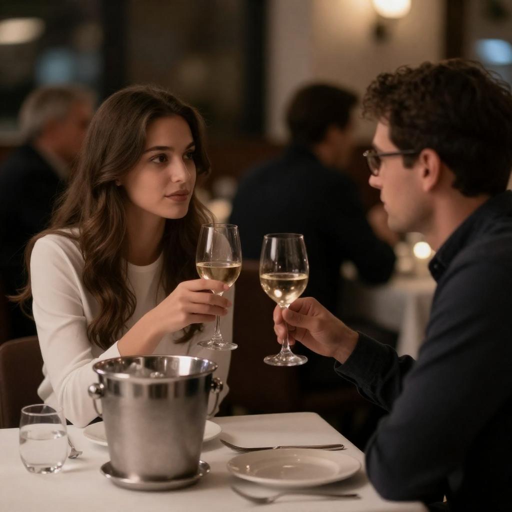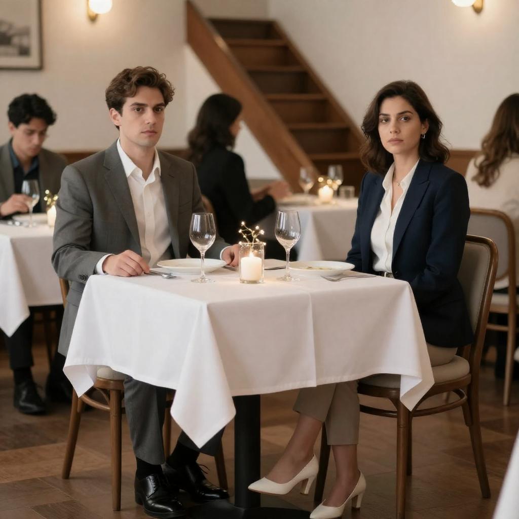 Photograph of a restaurant scene with a man in a gray suit and white shirt, and a woman in a navy blue suit and white shoes, sitting at a white-clothed table. They are surrounded by string lights, other diners, and wooden stairs in the background. The woman has dark brown hair and a serious expression, while the man looks relaxed.