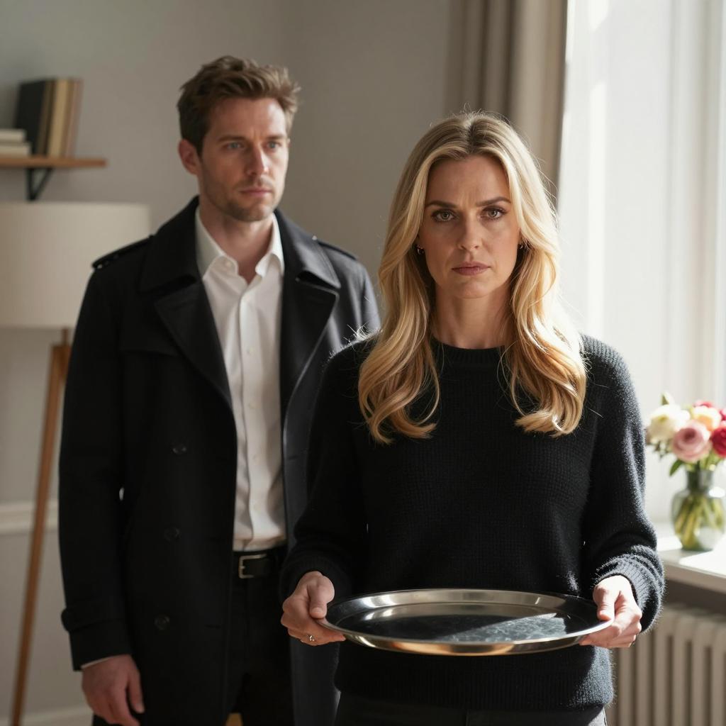 Two people in a store. Man with long brown hair, beard, gray jacket, black shirt, leaning forward. Woman with shoulder-length blonde hair, purple jacket, white shirt, looking to the side. Shelves with bottles in background. Man's face shows intense expression, woman's face neutral. Both positioned on the right side of the image.