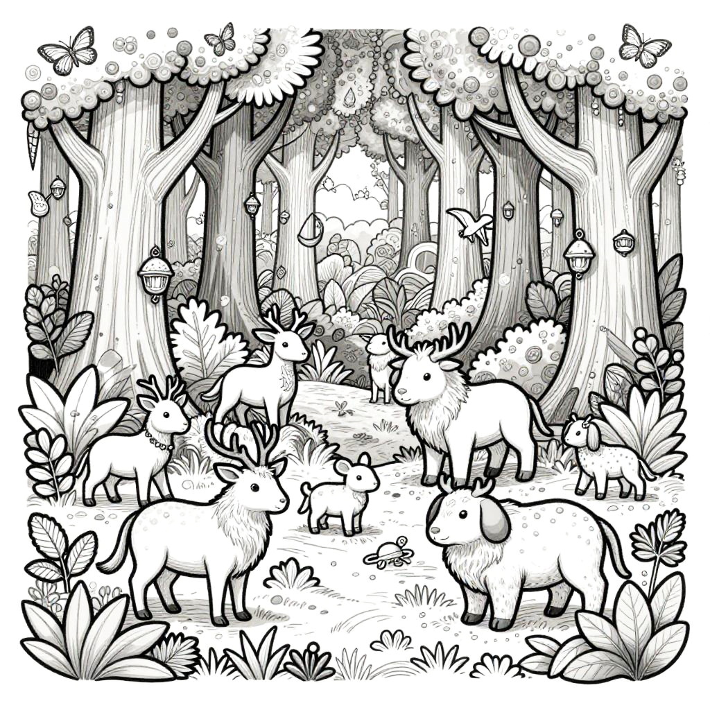 Best midjourney prompts for coloring pages depicting magical forest landscapes filled with mythical animals, lush foliage, and enchanted trees, all drawn in elegant line style perfect for both children and adults seeking peaceful coloring experiences.