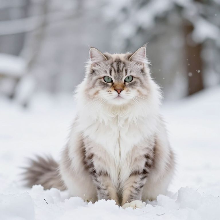 Majestic Siberian cat sits serenely in a snowy landscape, its fluffy fur contrasting beautifully against the pristine white snow and blurred winter trees in the background.