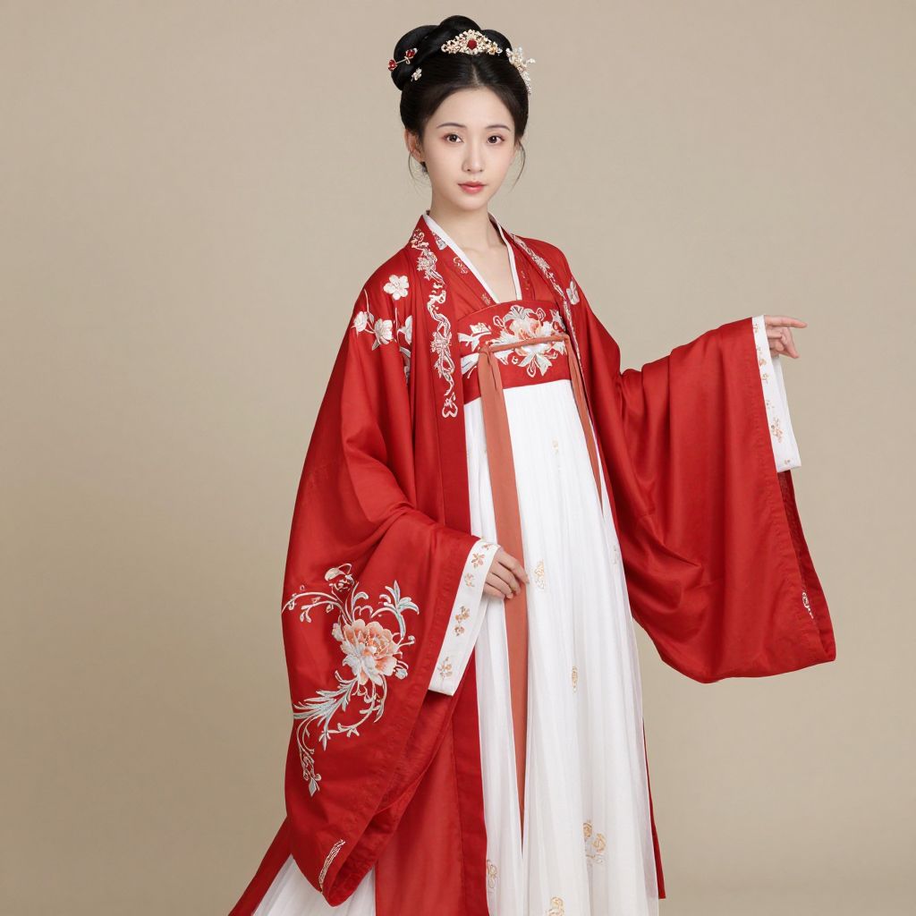 Elegant Linglu Improved Embroidery Hanfu showcases a woman in a vibrant red outer robe adorned with intricate floral embroidery, paired with a flowing white inner dress, complemented by traditional accessories and poised gracefully against a neutral backdrop.