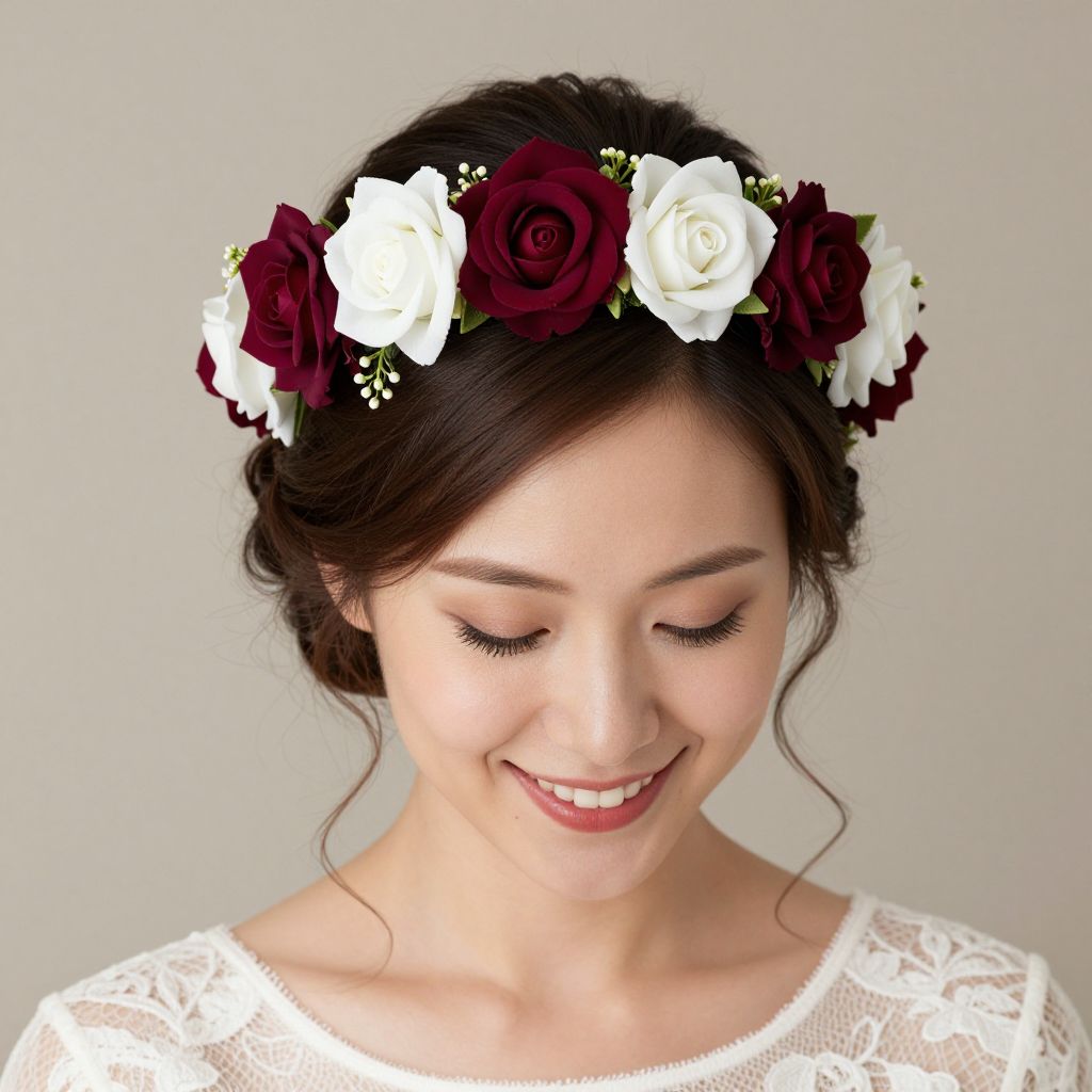 Elegant bridal accessory featuring a vibrant floral headband adorned with alternating burgundy and white roses, complemented by small green accents, gracefully crowning the head of a smiling woman in a delicate white lace top.