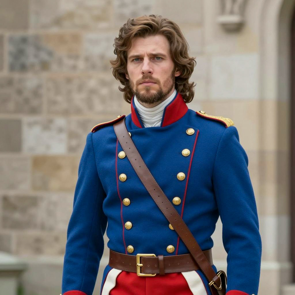 England costume man, photograph of a handsome man, early 30s, with light brown hair, neatly combed, light stubble, wearing a black jacket, brown vest with buttons, white lace-trimmed shirt, white neck scarf, serious expression, standing in front of a framed window, natural light, realistic style, historical clothing, masculine, detailed ures