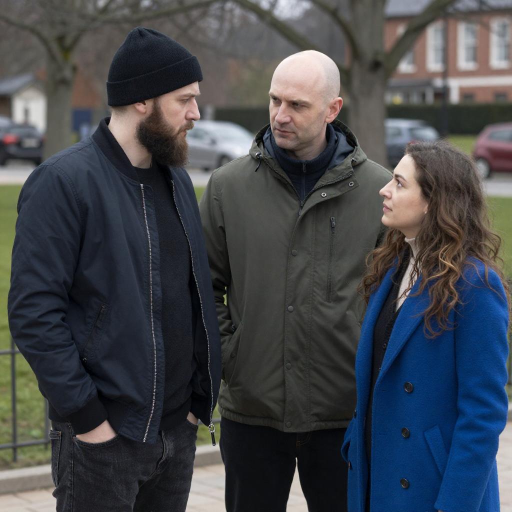 A man and woman engaged in a friendly conversation outdoors near a brick wall and an outdoor café. The man has glasses, a beard, and is wearing a black coat and red shirt, gesturing with his hands. The woman has long brown hair, wearing a green scarf, denim jacket, and carrying a brown purse. Background features blurred people, trees, and lanterns in a casual urban setting.