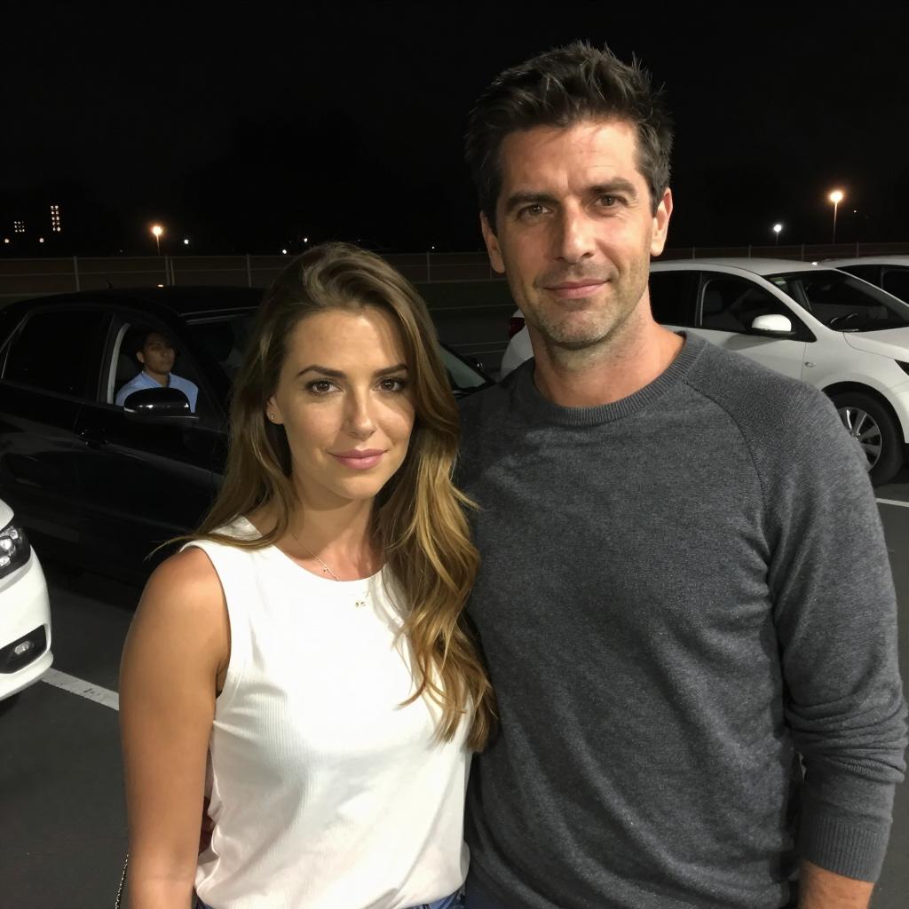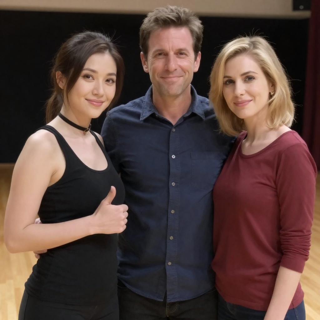 Photograph of three people, two women and one man, standing closely together indoors. Man in center with short brown hair, blue shirt, slight smile. Woman on left with dark brown hair, black tank top, choker, gentle smile, giving thumbs up. Woman on right with blonde hair, red long-sleeve shirt, gentle smile, arm around man. Wooden floor, dimly lit background.