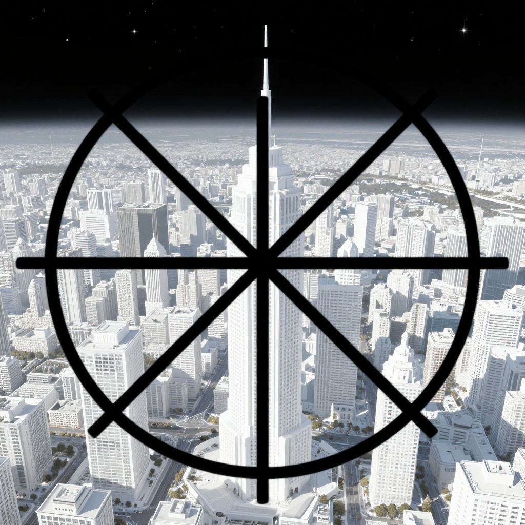 A digital image showing an aerial view of a dense urban cityscape with numerous white and gray skyscrapers. Overlaid on the cityscape is a large, black, bold crosshair symbol with a circle in the center. The background fades from the cityscape to a black, starry sky at the top. The crosshair's intersecting lines and circle dominate the foreground, creating a stark contrast against the detailed city below. The image combines realistic urban elements with a graphic, symbolic overlay.