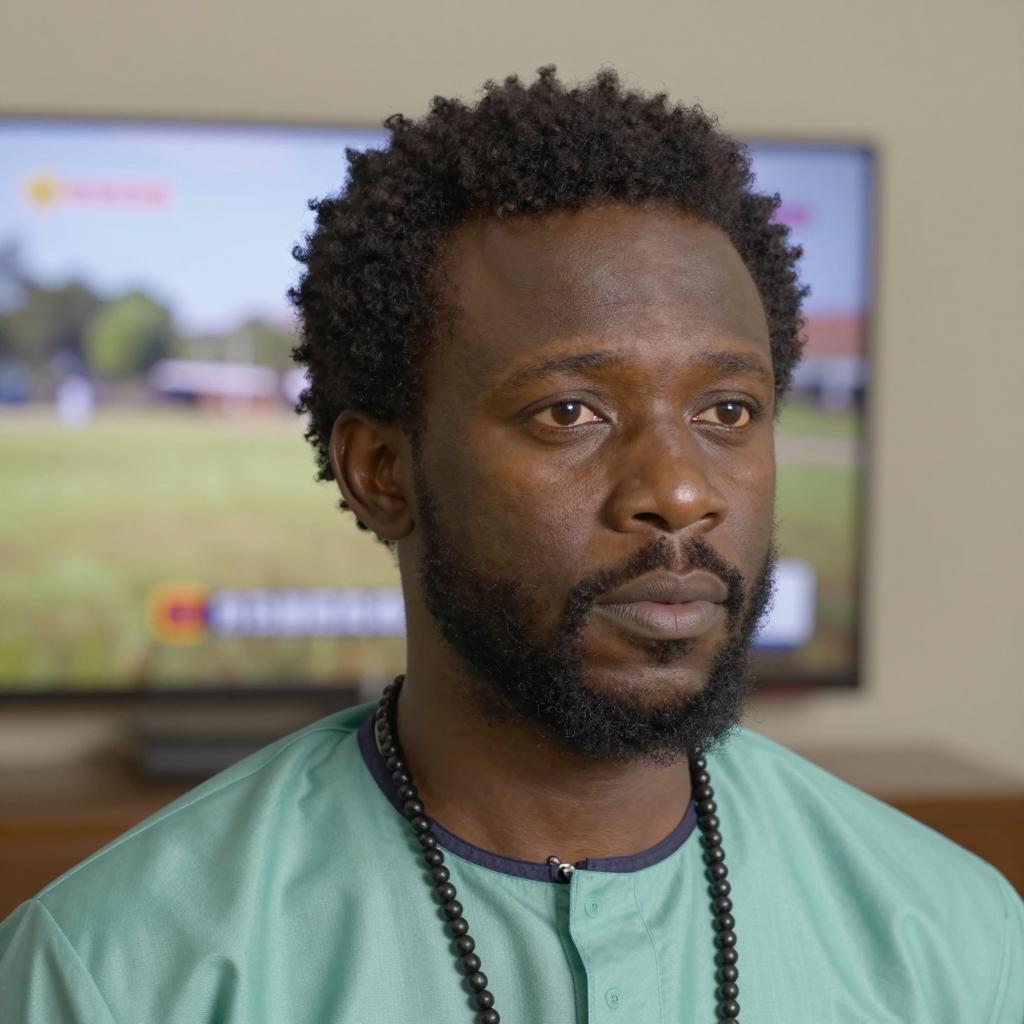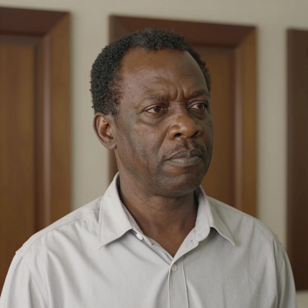 A middle-aged Black man with short, curly hair, wearing a light-colored, striped shirt. He has a serious expression and is slightly turning his head to the right. The background includes several large, rectangular, dark wooden panels on a wall. The man is positioned in the center, with his face and upper torso visible.