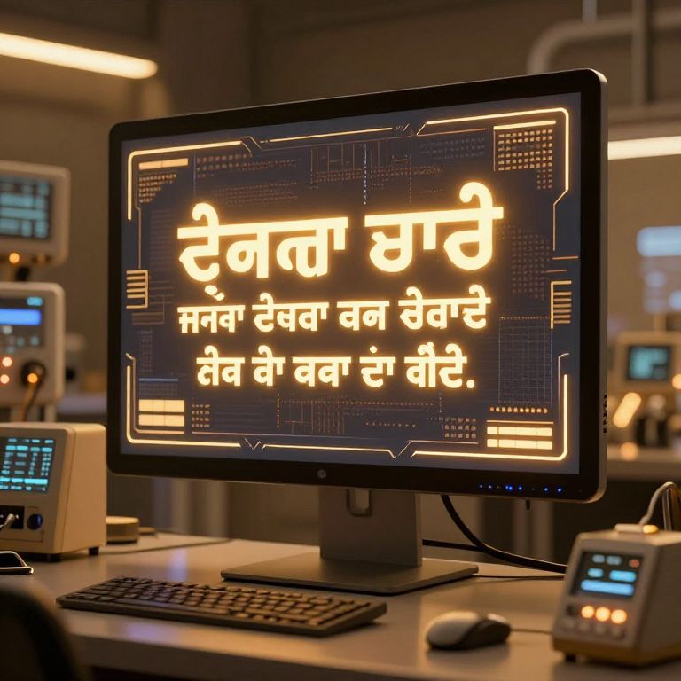 A Punjabi Gemini prompt displayed on a sleek, high-tech screen with flowing Punjabi script, animated data streams, and a warm golden hue representing cultural heritage, set in a futuristic Indian tech lab filled with glowing devices.