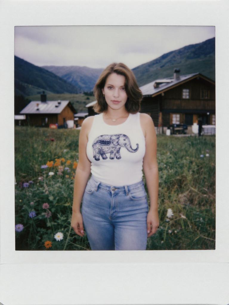 A Stocky woman in a white sleeveless tank top with an elephant print and light blue skinny jeans, captured in a polaroid instant camera style, standing by a mountain lodge surrounded by wildflowers. Sexy. Pretty face and beаutiful eyes. Big breasts